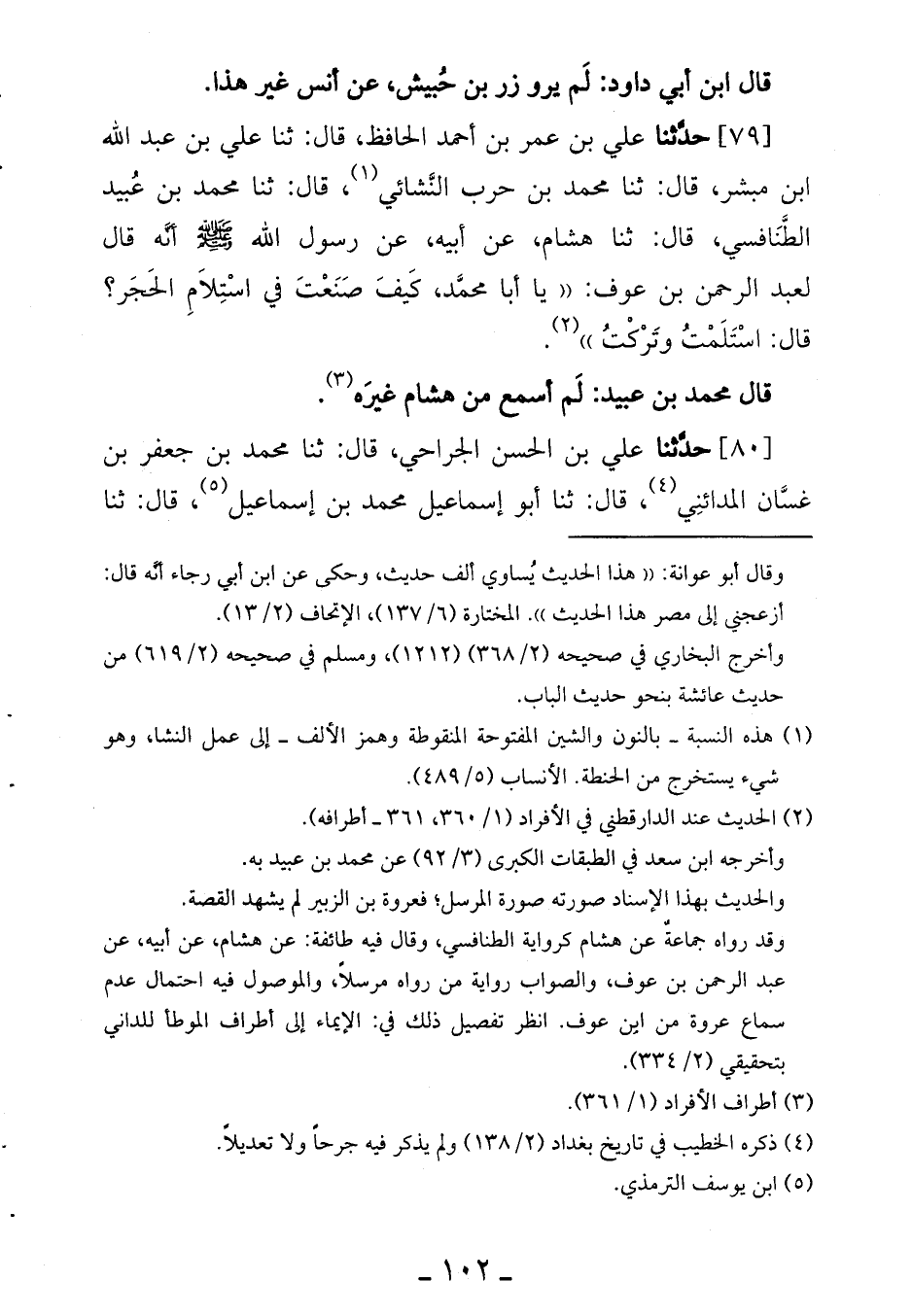 79- حدثنا علي بن عمر بن أحمد الحافظ قال: حدثنا علي بن عبد الله بن مبشر قال: حدثنا محمد بن حرب النَّشائي قال: حدثنا محمد بن عبيد الطنافسي قال: حدثنا هشام , عن أبيه عن رسول الله صلى الله عليه وسلم , أنه قال لعبد الرحمن بن عوف يا أبا محمد كيف صنعت في استلام الحجر قال استلمت وتركت.