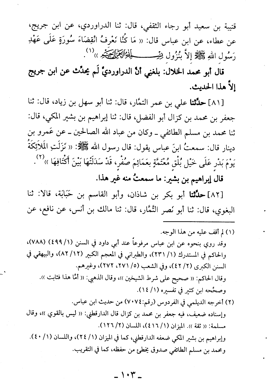 81- حدثنا علي بن عمر التمار قال: حدثنا أبو سهل بن زياد قال: حدثنا جعفر بن محمد بن كزال أبو الفضل قال: حدثنا إبراهيم بن بشير المكي قال: حدثنا محمد بن مسلم الطائفي وكان من عباد الله الصالحين عن عمرو بن دينار قال: سمعت ابن عباس يقول قال رسول الله صلى الله عليه وسلم نزلت الملائكة يوم بدر على خيل بلق معتمة بعمائم صفر قد سدلتها بين أكتافها.