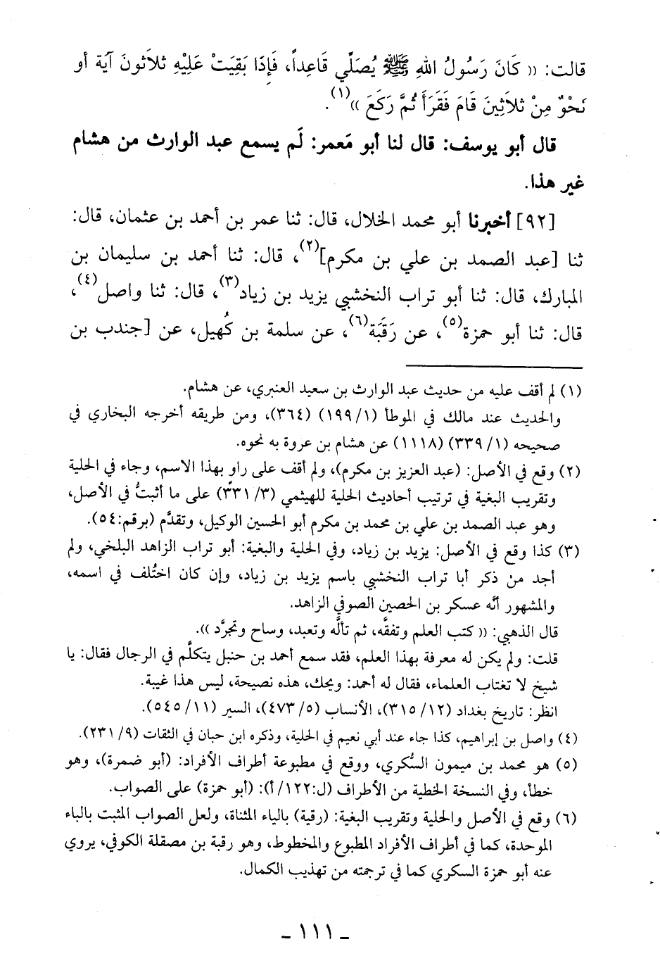 92- أخبرنا أبو محمد الخلال قال: حدثنا عمر بن أحمد بن عثمان قال: حدثنا [عبد الصَّمَد بن علي بن مكرم] قال: حدثنا أحمد بن سليمان بن المبارك قال: حدثنا أبو تراب النخشبي يزيد بن زياد قال: حدثنا واصل قال: حدثنا أبو حمزة عن رقبة عن سلمة بن كهيل عن [جندب بن -[112]- سفيان] قال سمعت رسول الله صلى الله عليه وسلم يقول من يسمع يسمع الله به ومن يرائي يرائي الله به.