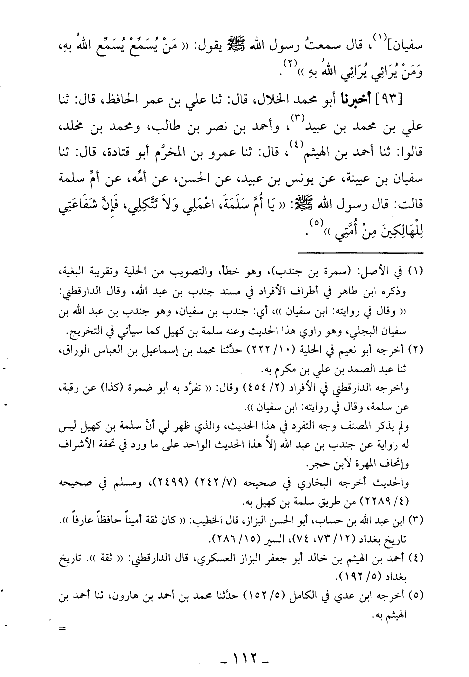 93- أخبرنا أبو محمد الخلال قال: حدثنا علي بن عمر الحافظ قال: حدثنا علي بن محمد بن عبيد وأحمد بن نصر بن طالب ومحمد بن مخلد قالوا حدثنا أحمد بن الهيثم قال حدثنا عمرو بن المخرم أبو قتادة قال: حدثنا سفيان بن عيينة عن يونس بن عبيد عن الحسن عن أمه عن أم سلمة قالت قال رسول الله صلى الله عليه وسلم يا أم سلمة اعملي ولا تتكلي فإن شفاعتي للهالكين من أمتي.