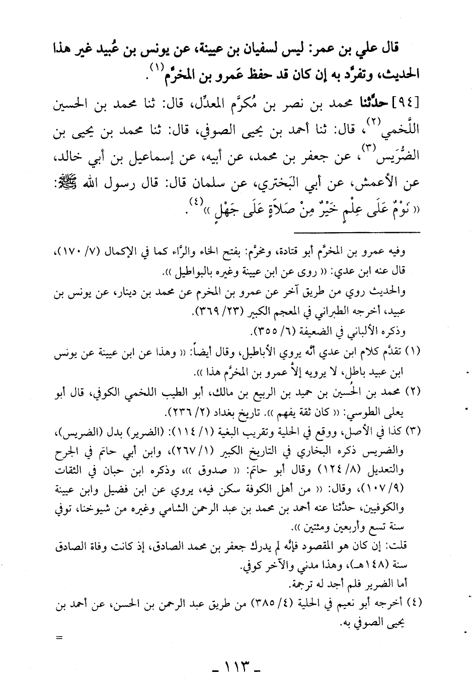 94- حدثنا محمد بن نصر بن مكرم المعدل قال: حدثنا محمد بن الحسين اللخمي قال: حدثنا أحمد بن يحيى الصوفي قال: حدثنا محمد بن يحيى بن الضريس عن جعفر بن محمد , عن أبيه عن إسماعيل بن أبي خالد عن الأعمش عن أبي البختري عن سلمان قال: قال رسول الله صلى الله عليه وسلم نوم على علم خير من صلاة على جهل.