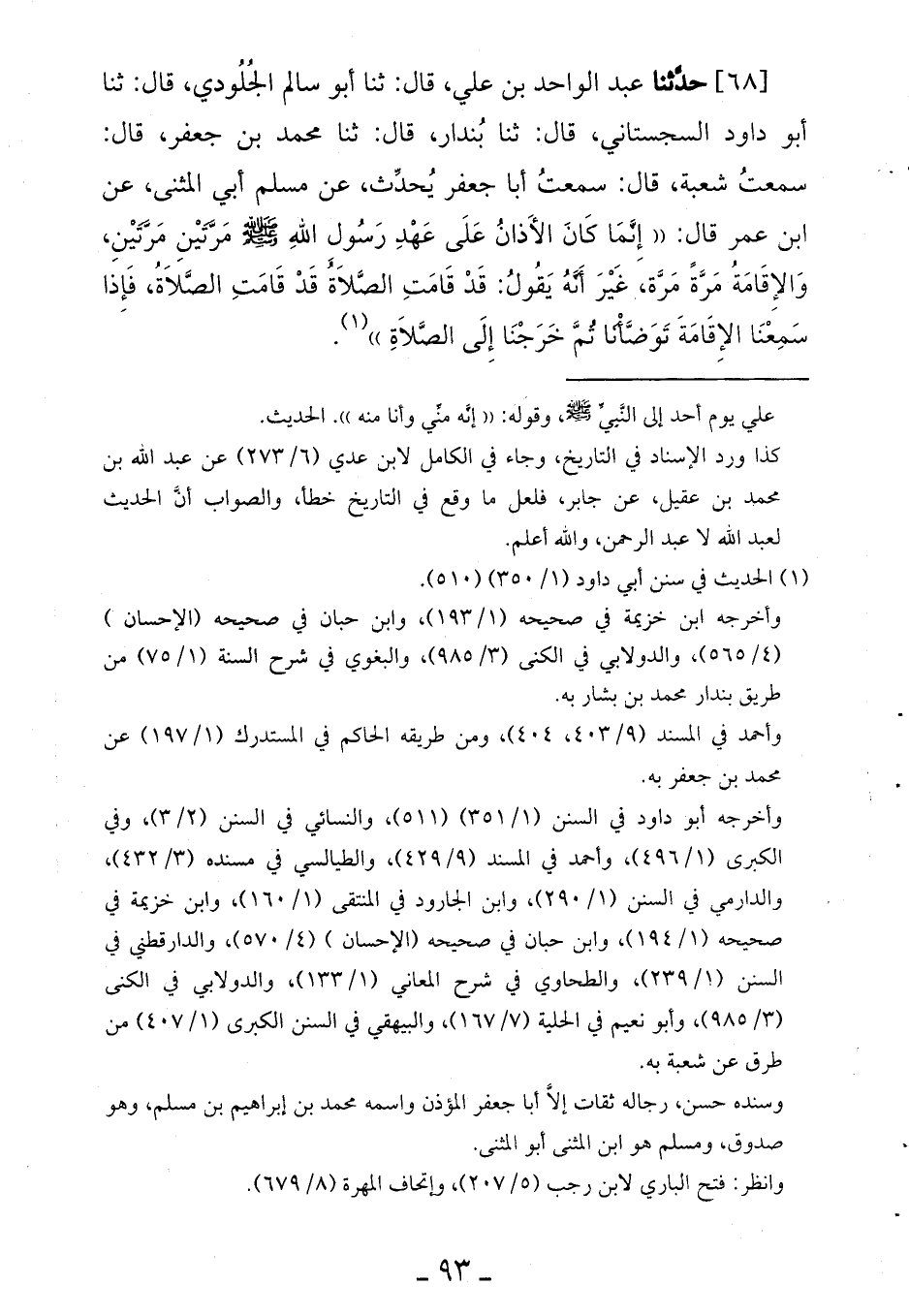 68- حدثنا عبد الواحد بن علي قال: حدثنا أبو سالم الجلودي قال: حدثنا أبو داود السجستاني قال: حدثنا بندار قال: حدثنا محمد بن جعفر قال: سمعت شعبة قال: سمعت أبا جعفر يحدث عن مسلم أبي المثنى عن ابن عمر قال إنما كان الأذان على عهد رسول الله صلى الله عليه وسلم مرتين مرتين والإقامة مرة مرة غير أنه يقول قد قامت الصلاة قد قامت الصلاة , فإذا سمعنا الإقامة توضأنا ثم خرجنا إلى الصلاة.