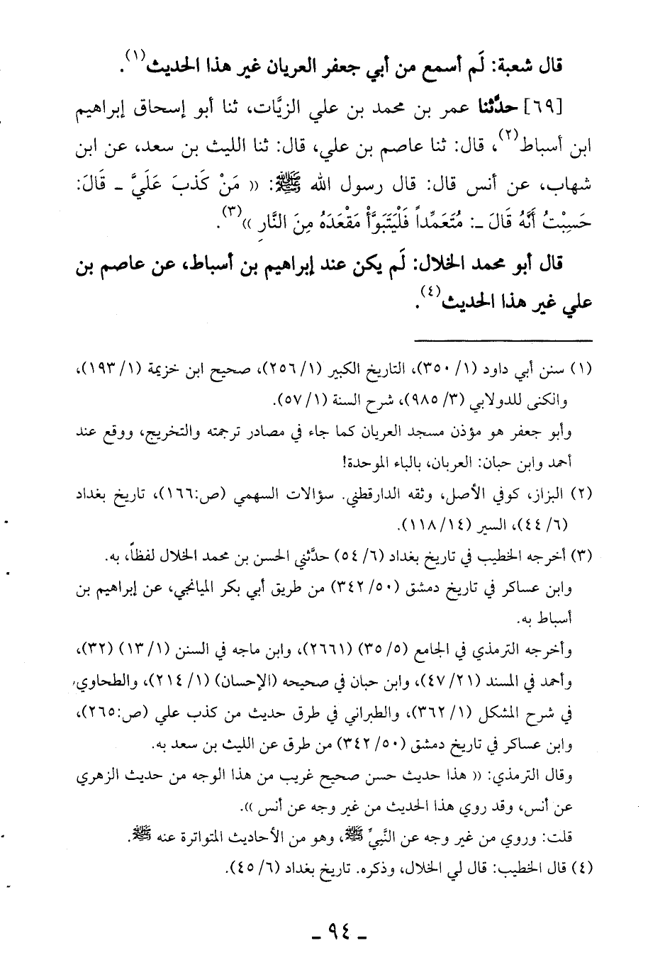 69- حدثنا عمر بن محمد بن علي الزيات حدثنا أبو إسحاق إبراهيم بن أسباط قال: حدثنا عاصم بن علي قال: حدثنا الليث بن سعد عن ابن شهاب عن أنس قال: قال رسول الله صلى الله عليه وسلم من كذب علي قال حسبت , أنه قال: متعمدا فليتبوأ مقعده من النار.