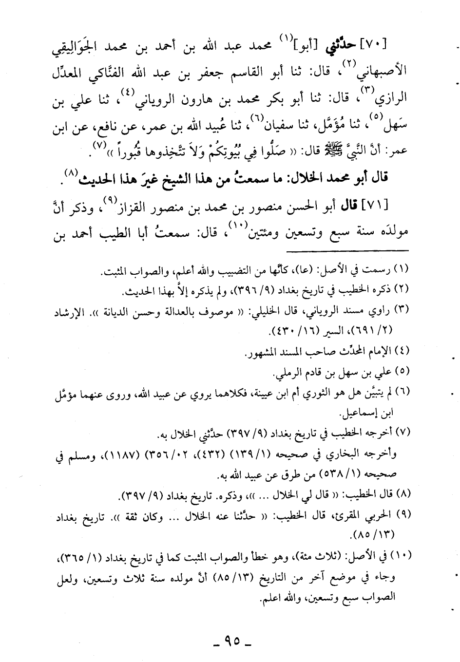 70- حدثني [أبو] محمد عبد الله بن أحمد بن محمد الجواليقي الأصبهاني قال: حدثنا أبو القاسم جعفر بن عبد الله الفناكي المعدل الرازي قال: حدثنا أبو بكر محمد بن هارون الروياني حدثنا علي بن سهل حدثنا مؤمل حدثنا سفيان حدثنا عبيد الله بن عمر عن نافع عن ابن عمر أن النبي صلى الله عليه وسلم قال صلوا في بيوتكم ولا تتخذوها قبورا.