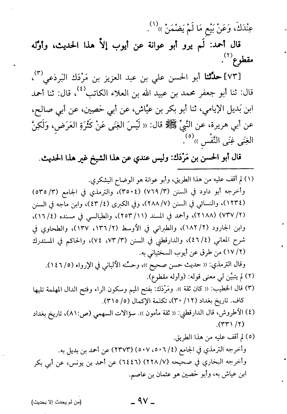 73- حدثنا أبو الحسن علي بن عبد العزيز بن مردك البرذعي قال: حدثنا أبو جعفر محمد بن عبيد الله بن العلاء الكاتب قال: حدثنا أحمد بن بديل الإيامي حدثنا أبو بكر بن عياش عن أبي حصين عن أبي صالح عن أبي هريرة عن النبي صلى الله عليه وسلم قال ليس الغنى عن كثرة العرض ولكن الغنى غنى النفس.