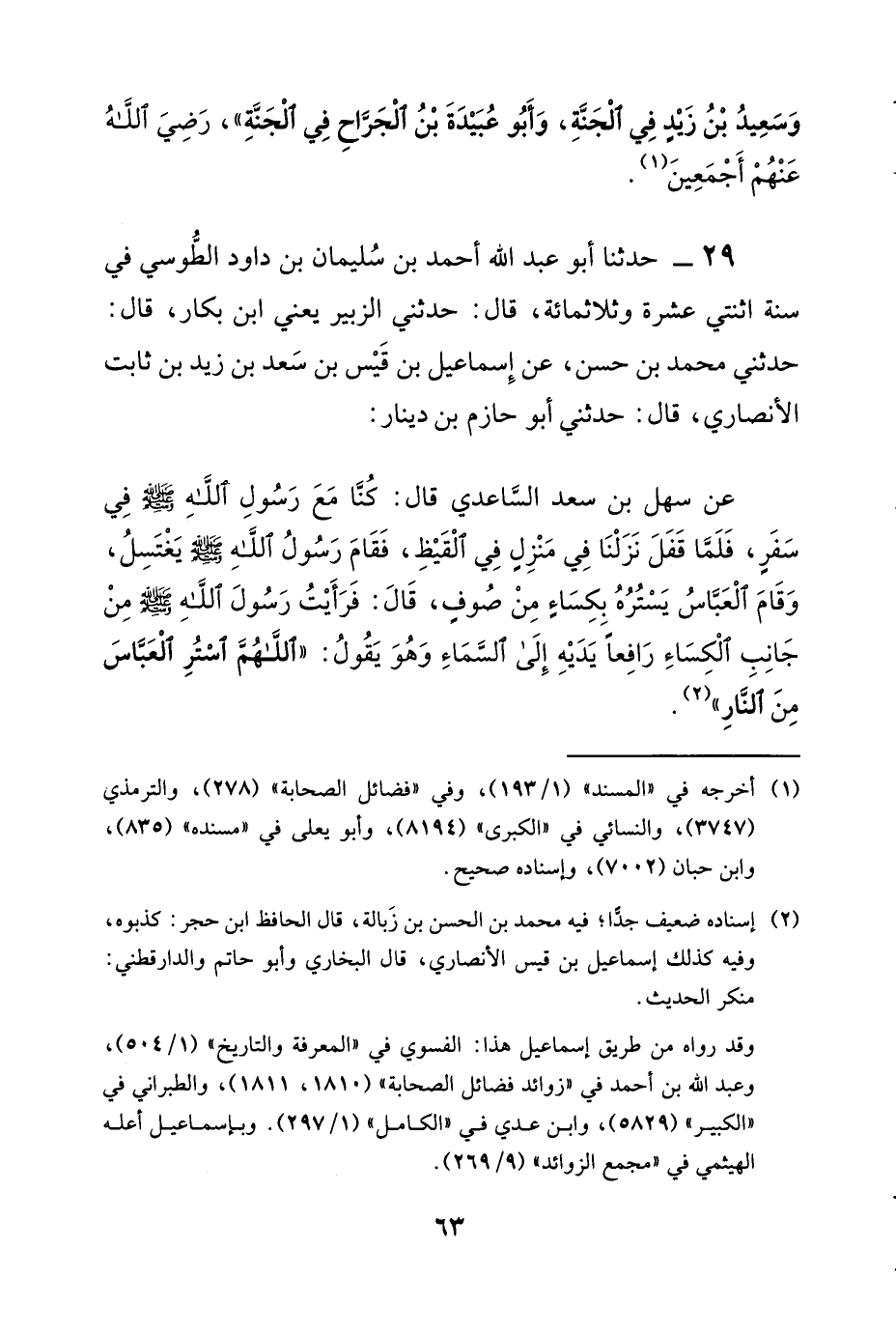 29 - حَدَّثَنَا أَبُو عَبْدِ اللَّهِ أَحْمَدُ بْنُ سُلَيْمَانَ بْنِ دَاوُدَ الطُّوسِيُّ فِي سَنَةِ اثْنَتَيْ عَشْرَةَ وَثَلَاثِمِائَةٍ، قَالَ: حَدَّثَنِي الزُّبَيْرُ - يَعْنِي: ابْنَ بَكَّارٍ قَالَ: حَدَّثَنِي مُحَمَّدُ بْنُ حَسَنٍ، عَنْ إِسْمَاعِيلَ بْنِ قَيْسِ بْنِ سَعْدِ بْنِ زَيْدِ بْنِ ثَابِتٍ الْأَنْصَارِيِّ قَالَ: حَدَّثَنِي أَبُو حَازِمِ بْنُ دِينَارٍ، عَنْ سَهْلِ بْنِ سَعْدٍ السَّاعِدِيِّ، قَالَ: كُنَّا مَعَ رَسُولِ اللَّهِ صَلَّى اللَّهُ عَلَيْهِ وَسَلَّمَ فِي سَفَرٍ، فَلَمَّا قَفَلَ نَزَلْنَا فِي مَنْزِلٍ فِي الْقَيْظِ، فَقَامَ رَسُولُ اللَّهِ صَلَّى اللَّهُ عَلَيْهِ وَسَلَّمَ يَغْتَسِلُ، وَقَامَ الْعَبَّاسُ يَسْتُرُهُ بِكِسَاءٍ مِنْ صُوفٍ، قَالَ: فَرَأَيْتُ رَسُولَ اللَّهِ صَلَّى اللَّهُ عَلَيْهِ وَسَلَّمَ مِنْ جَانِبِ الْكِسَاءِ رَافِعًا يَدَيْهِ إِلَى السَّمَاءِ، وَهُوَ يَقُولُ: §«اللَّهُمَّ اسْتُرِ الْعَبَّاسَ مِنَ النَّارِ»