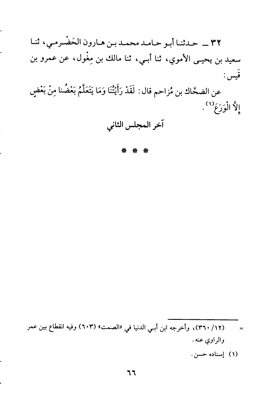 32 - حَدَّثَنَا أَبُو حَامِدٍ مُحَمَّدُ بْنُ هَارُونَ الْحَضْرَمِيُّ، ثنا سَعِيدُ بْنُ يَحْيَى الْأُمَوِيُّ، ثنا أَبِي، ثنا مَالِكُ بْنُ مِغْوَلٍ، عَنْ عَمْر بْنِ قَيْسٍ، عَنِ الضَّحَّاكِ بْنِ مُزَاحِمٍ، قَالَ: «لَقَدْ رَأَيْتُنَا §وَمَا يَتَعَلَّمُ بَعْضُنَا مِنْ بَعْضٍ إِلَّا الْوَرَعَ»