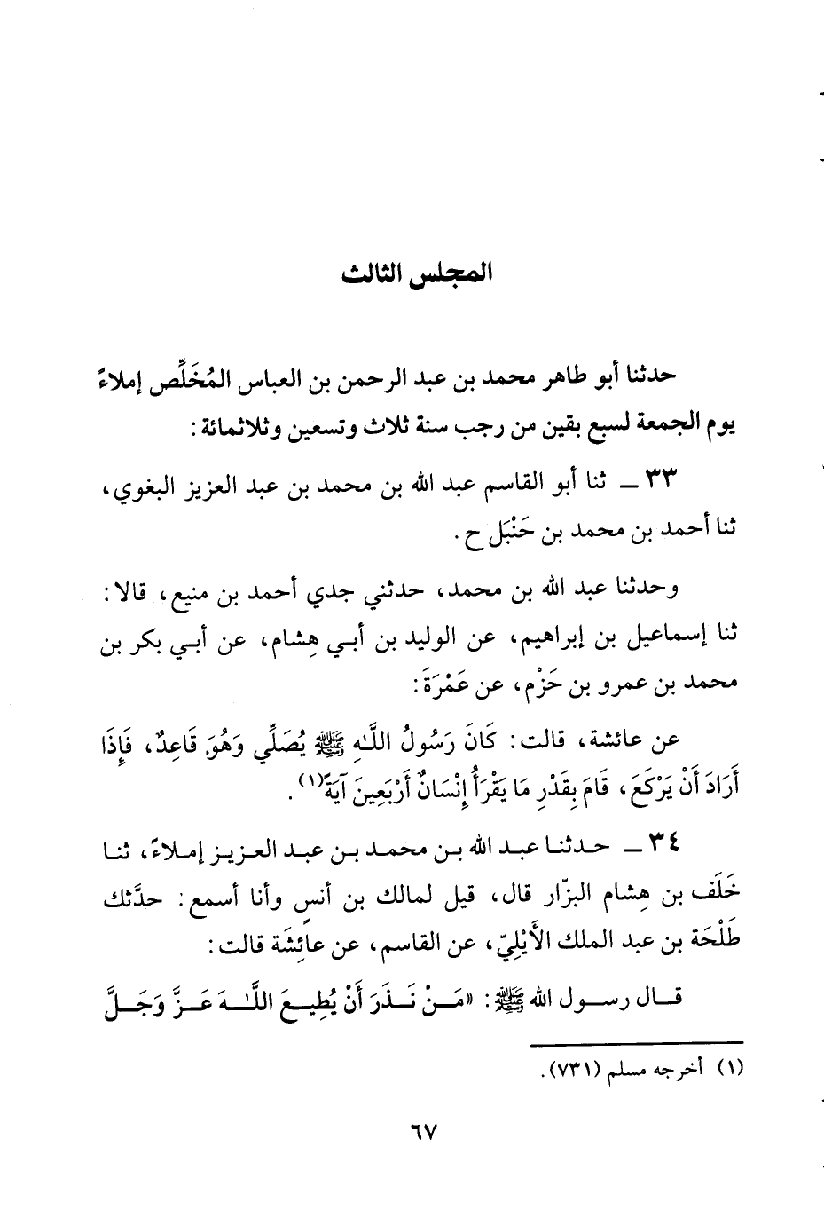 33 - حَدَّثَنَا أَبُو طَاهِرٍ مُحَمَّدُ بْنُ عَبْدِ الرَّحْمَنِ بْنِ الْعَبَّاسِ الْمُخْلِصُ إِمْلَاءً يَوْمَ الْجُمُعَةِ لِسَبْعٍ بَقِينَ مِنْ رَجَبٍ سَنَةَ ثَلَاثٍ وَتِسْعِينَ وَثَلَاثِمِائَةٍ , ثنا أَبُو الْقَاسِمِ عَبْدُ اللَّهِ بْنُ مُحَمَّدِ بْنِ عَبْدِ الْعَزِيزِ الْبَغَوِيُّ، ثنا أَحْمَدُ بْنُ مُحَمَّدِ بْنِ حَنْبَلٍ، ح وَحَدَّثَنَا عَبْدُ اللَّهِ بْنُ مُحَمَّدٍ حَدَّثَنِي جَدِّي أَحْمَدُ بْنُ مَنِيعٍ , قَالَا: ثنا إِسْمَاعِيلُ بْنُ إِبْرَاهِيمَ، عَنِ الْوَلِيدِ بْنِ أَبِي هِشَامٍ، عَنْ أَبِي بَكْرِ بْنِ مُحَمَّدِ بْنِ عَمْرِو بْنِ حَزْمٍ، عَنْ عَمْرَةَ، عَنْ عَائِشَةَ، قَالَتْ: «كَانَ رَسُولُ اللَّهِ صَلَّى اللَّهُ عَلَيْهِ وَسَلَّمَ يُصَلِّي وَهُوَ قَاعِدٌ، §فَإِذَا أَرَادَ أَنْ يَرْكَعَ قَامَ بِقَدْرِ مَا يَقْرَأُ إِنْسَانٌ أَرْبَعِينَ آيَةً»