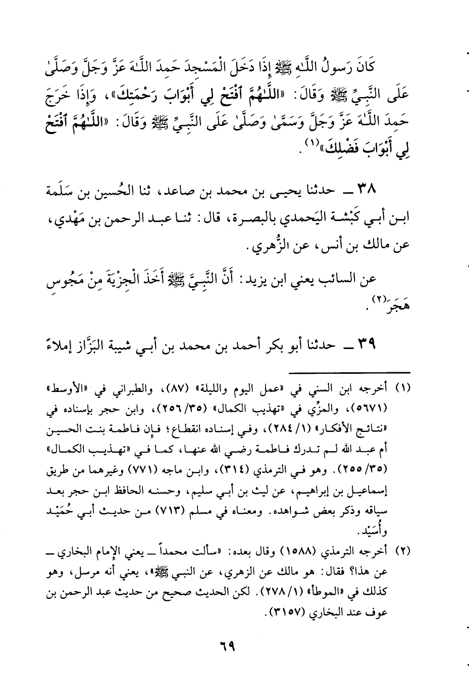38 - حَدَّثَنَا يَحْيَى بْنُ مُحَمَّدِ بْنِ صَاعِدٍ، ثنا الْحُسَيْنُ بْنُ سَلَمَةَ بْنِ أَبِي كَبْشَةَ الْيَحْمُدِيُّ بِالْبَصْرَةِ قَالَ: ثنا عَبْدُ الرَّحْمَنِ بْنُ مَهْدِيٍّ، عَنْ مَالِكِ بْنِ أَنَسٍ، عَنِ الزُّهْرِيِّ، عَنِ السَّائِبِ يَعْنِي ابْنَ يَزِيدَ، أَنَّ النَّبِيَّ صَلَّى اللَّهُ عَلَيْهِ وَسَلَّمَ §«أَخَذَ الْجِزْيَةَ مِنْ مَجُوسِ هَجَرَ»