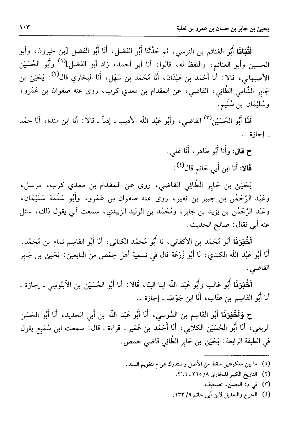 أنبأنا أبو الغنائم بن النرسي ثم حدثنا أبو الفضل أنا أبو الفضل بن خيرون وأبو الحسين وأبو الغنائم واللفظ له قالوا أنا أبو أحمد زاد أبو الفضل (1) وأبو الحسين الأصبهاني قالا أنا أحمد بن عبدان أنا محمد بن سهل أنا البخاري قال (2) يحيى بن جابر الشامي الطائي القاضي عن المقدام بن معدي كرب روى عنه صفوان بن عمرو وسليمان بن سليم أنا أبو الحسين (3) القاضي وأبو عبد الله الأديب إذنا قالا أنا ابن مندة أنا حمد إجازة ح قال وأنا أبو طاهر أنا علي قالا أنا ابن أبي حاتم قال (4) يحيى بن جابر الطائي القاضي روى عن المقدام بن معدي كرب مرسل وعبد الرحمن بن جبير بن نفير روى عنه صفوان بن عمرو وأبو سلمة سليمان وعبد الرحمن بن يزيد بن جابر ومحمد بن الوليد الزبيدي سمعت أبي يقول ذلك سئل عنه أبي فقال صالح الحديث أخبرنا أبو محمد بن الأكفاني نا أبو محمد الكتاني أنا أبو القاسم تمام بن محمد أنا أبو عبد الله الكندي نا أبو زرعة قال في تسمية أهل حمص من التابعين بن جابر القاضي أخبرنا أبو غالب وأبو عبد الله ابنا البنا قالا أنا أبو الحسين بن الآبنوسي إجازة أنا أبو القاسم بن عتاب أنا ابن جوصا إجازة ح وأخبرنا أبو القاسم بن السوسي أنا أبو عبد الله بن أبي الحديد أنا أبو الحسن الربعي أنا أبو الحسين الكلابي أنا أحمد بن عمير قراءة قال سمعت ابن سميع يقول في الطبقة الرابعة يحيى بن جابر الطائي قاضي حمص