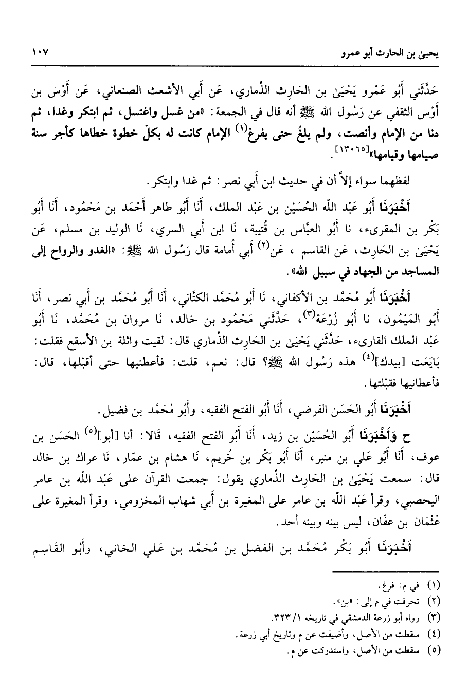 [13065] لفظهما سواء إلا أن في حديث ابن أبي نصر ثم غدا وابتحر وابتكر أخبرنا أبو عبد الله الحسين بن عبد الملك أنا أبو طاهر أحمد بن محمود أنا أبو بكر بن المقرئ نا أبو العباس بن قتيبة نا ابن أبي السري نا الوليد بن مسلم عن يحيى بن الحارث عن القاسم عن (2) أبي أمامة قال رسول الله (صلى الله عليه وسلم) الغدو والرواح إلى المساجد من الجهاد في سبيل الله أخبرنا أبو محمد الأكفاني نا أبو محمد الكتاني أنا أبو محمد بن أبي نصر أنا أبو الميمون نا أبو زرعة (3) حدثني محمود بن خالد نا مروان بن محمد نا أبو عبد الملك القارئ حدثني يحيى بن الحارث الذماري قال لقيت واثلة بن الأسقع فقلت بايعت بيدك (4) هذه رسول الله (صلى الله عليه وسلم) قال نعم قلت فأعطنيها حتى أقبلها قال فأعطانيها فقبلتها أخبرنا أبو الحسن الفرضي أنا أبو الفتح الفقيه وأبو محمد بن فضيل ح وأخبرنا أبو الحسين بن زيد أنا أبو الفتح الفقيه قالا أنا أبو (5) الحسن بن عوف أنا أبو علي بن منير أنا أبو بكر بن خريم نا هشام بن عمار نا عراك بن خالد قال سمعت يحيى بن الحارث الذماري يقول جمعت القرآن على عبد الله بن عامر اليحصبي وقرأ عبد الله بن عامر على المغيرة بن أبي شهاب المخزومي وقرأ المغيرة على عثمان بن عفان ليس بينه وبينه أحد أخبرنا أبو بكر محمد بن الفضل بن محمد بن علي الخاني وأبو القاسم