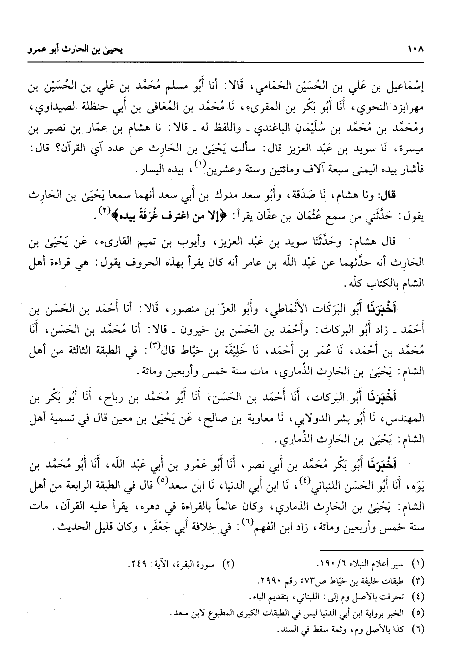 إسماعيل بن علي بن الحسين الحمامي قالا أنا أبو مسلم محمد بن علي بن الحسين بن مهرابزد النحوي أنا أبو بكر بن المقرئ نا محمد بن المعافى بن أبي حنظلة الصيداوي ومحمد بن محمد بن سليمان الباغندي واللفظ له قالا نا هشام بن عمار بن نصير بن ميسرة نا سويد بن عبد العزيز قال سألت يحيى بن الحارث عن عدد آي القرآن قال فأشار بيده اليمنى سبعة آلاف ومائتين وستة وعشرين (1) بيده اليسار قال هشام نا صدقة وأبو سعد مدرك بن أبي سعد أنهما سمعا يحيى بن الحارث يقول حدثني من سمع عثمان بن عفان يقرأ " إلا من اغترف غرفة بيده (2) قال ونا هشام وحدثنا سويد بن عبد العزيز وأيوب بن تميم القارئ عن يحيى بن الحارث أنه حدثهما عن عبد الله بن عامر أنه كان يقرأ بهذه الحروف يقول هي قراءة أهل الشام بالكتاب كله أخبرنا أبو البركات الأنماطي وأبو العز بن منصور قالا أنا أحمد بن الحسن بن أحمد زاد أبو البركاب وأحمد بن الحسن بن خيرون قالا أنا محمد بن الحسن أنا محمد بن أحمد نا عمر بن أحمد نا خليفة بن خياط قال (3) في الطبقة الثالثة من أهل الشام يحيى بن الحارث الذماري مات سنة خمس وأربعين ومائة أخبرنا أبو البركات أنا أحمد بن الحسن أنا أبو محمد بن رباح أنا أبو بكر بن المهندس نا أبو بشر الدولابي نا معاوية بن صالح عن يحيى بن معين قال في تسمية أهل الشام يحيى بن الحارث الذماري أخبرنا أبو بكر محمد بن أبي نصر أنا أبو عمرو بن أبي عبد الله أنا أبو محمد بن يوه أنا أبو الحسن اللبناني (4) نا ابن أبي الدنيا نا ابن سعد (5) قال في الطبقة الرابعة من أهل الشام يحيى بن الحارث الذماري وكان عالما بالقراءة في دهره يقرأ عليه القرآن مات سنة خمس وأربعين ومائة زاد ابن الفهم (6) في خلافة أبي جعفر وكان قليل الحديث