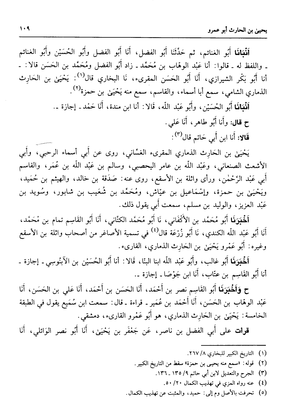 أنبأنا أبو الغنائم ثم حدثنا أبو الفضل أنا أبو الفضل وابو الحسين وابو الغنائم واللفظ له قالوا أنا عبد الوهاب بن محمد زاد أبو الفضل ومحمد بن الحسن قالا أنا أبو بكر الشيرازي أنا أبو الحسن المقرئ نا البخاري قال (1) يحيى بن الحارث الذماري الشامي سمع أبا أسماء والقاسم سمع منه يحيى بن حمزة (2) أنبأنا أبو الحسين وأبو عبد الله قالا أنا ابن مندة أنا حمد إجازة ح قال وأنا أبو طاهر أنا علي قالا أنا ابن أبي حاتم قال (3) يحيى بن الحارث الذماري المقرئ الغساني روى عن أبي أسماء الرحبي وأبي الأشعت الصنعاني وعبد الله بن عامر اليحصبي وسالم بن عبد الله بن عمر والقاسم أبي عبد الرحمن ورأى واثلة بن الأسقع روى عنه صدقة بن خالد والهيثم بن حميد ويحيى بن حمزة وإسماعيل بن عياش ومحمد بن شعيب بن شابور وسويد بن عبد العزيز والوليد بن مسلم سمعت أبي يقول ذلك أخبرنا أبو محمد بن الأكفاني نا أبو محمد الكتاني أنا أبو القاسم تمام بن محمد أنا أبو عبد الله الكندي نا أبو زرعة قال (4) في تسمية الأصغار من أصحاب واثلة بن الأسقع وغيره أبو عمرو ويحيى بن الحارث الذماري القارئ أخبرنا أبو غالب وأبو عبد الله ابنا البنا قالا أنا أبو الحسين بن الآبنوسي إجازة أنا أبو القاسم بن عتاب أنا ابن جوصا أإجازة ح وأخبرنا أبو القاسم نصر بن أحمد أنا الحسن بن أحمد أنا علي بن الحسن أنا عبد الوهاب بن الحسن أنا أحمد بن عمير قراءة قال سمعت ابن سميع يقول في الطبقة الخامسة يحيى بن الحارث الذماري هو أبو عمرو القارئ دمشقي قرأت على أبي الفضل بن ناصر عن جعفر بن يحيى أنا أبو نصر الوائلي أنا