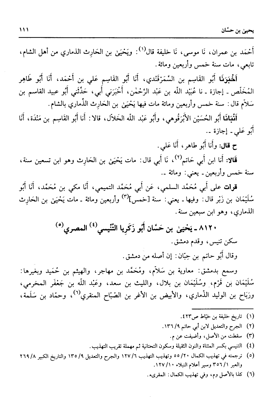 8120 - يحيى بن حسان أبو زكريا التنيسي (4) المصري (5) سكن تنيس وقدم دمشق وقال أبو حاتم بن حبان إن أصله من دمشق وسمع بدمشق معاوية بن سلام ومحمد بن مهاجر والهيثم بن حميد وبغيرها سليمان بن قرم وسليمان بن بلال والليث بن سعد وعبد الله بن جعفر المخرمي ورباح بن الوليد الذماري والأبيض بن الأغر بن الصباح المنقري (6) وحماد بن سلمة
