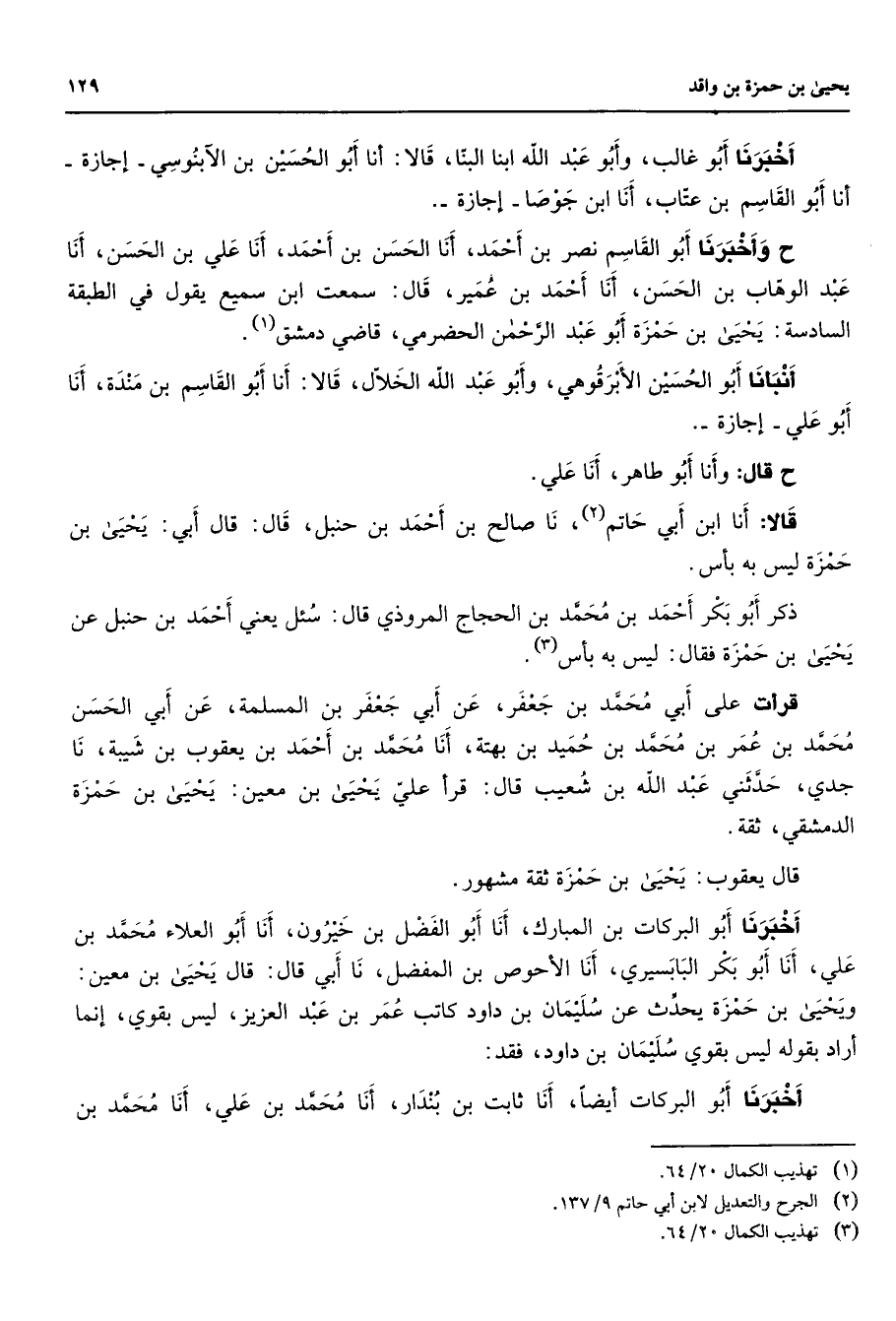 أخبرنا أبو غالب وأبو عبد الله ابنا البنا قالا أنا أبو الحسين بن الآبنوسي إجازة أنا أبو القاسم بن عتاب أنا ابن جوصا إجازة ح وأخبرنا أبو القاسم نصر بن أحمد أنا الحسن بن أحمد أنا علي بن الحسن أنا عبد الوهاب بن الحسن أنا أحمد بن عمير قال سمعت ابن سميع يقول في الطبقة السادسة يحيى بن حمزة أبو عبد الرحمن الحضرمي قاضي دمشق (1) أنبأنا أبو الحسين الأبرقوهي وأبو عبد الله الخلال قالا أنا أبو القاسم بن مندة أنا أبو علي إجازة ح قال وأنا أبو طاهر أنا علي قالا أنا ابن أبي حاتم (2) نا صالح بن أحمد بن حنبل قال قال أبي يحيى بن حمزة ليس به بأس ذكر أبو بكر أحمد بن محمد بن الحجاج المروذي قال سئل يعني أحمد بن حنبل عن يحيى بن حمزة فقال ليس به بأس (3) قرأت على أبي محمد بن جعفر عن أبي جعفر بن المسلمة عن أبي الحسن محمد بن عمر بنة محمد بن حميد بن بهتة أنا محمد بن أحمد بن يعقوب بن شيبة نا جدي حدثني عبد الله بن شعيب قال قرأ علي يحيى بن معين يحيى بن حمزة الدمشقي ثقة قال يعقوب يحيى بن حمزة ثقة مشهور أخبرنا أبو البركات بن المبارك أنا أبو الفضل بن خيرون أنا أبو العلاء محمد بن علي أنا أبو بكر البابسيري أنا الأحوص بن المفضل نا أبي قال قال يحيى بن معين ويحيى بن حمزة يحدث عن سليمان بن داود كاتب عمر بن عبد العزيز ليس بقوي إنما أراد بقوله ليس بقوي سليمان بن داود فقد أخبرنا أبو البركات أيضا أنا ثابت بن بندار أنا محمد بن علي أنا محمد بن