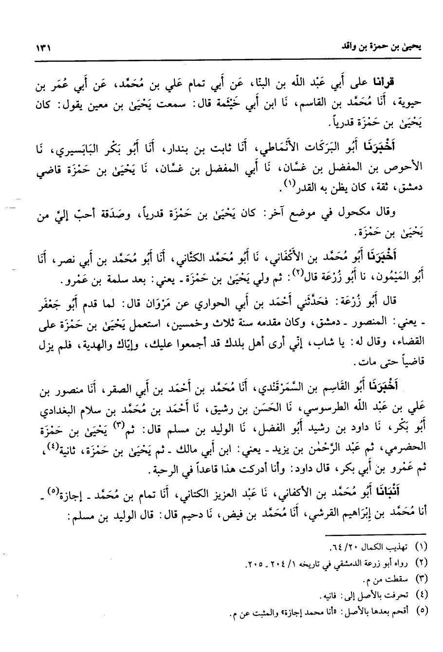 قرأنا على أبي عبد الله بن البنا عن أبي تمام علي بن محمد عن أبي عمر بن حيوية أنا محمد بن القاسم نا ابن أبي خيثمة قال سمعت يحيى بن معين يقول كان يحيى بن حمزة قدريا أخبرنا أبو البركات الأنماطي أنا ثابت بن بندار أنا أبو بكر البابسيري نا الأحوص بن المفضل بن غسان نا أبي المفضل بن غسان نا يحيى بن حمزة قاضي دمشق ثقة كان يظن به القدر (1) وقال مكحول في موضع آخر كان يحيى بن حمزة قدريا وصدقه أحب إلي من يحيى بن حمزة أخبرنا أبو محمد بن الأكفاني نا أبو محمد الكتاني أنا أبو محمد بن أبي نصر أنا أبو الميمون نا أبو زرعة قال (2) ثم ولي يحيى بن حمزة يعني بعد سلمة بن عمرو قال أبو زرعة فحدثني أحمد بن أبي الحواري عن مروان قال لما قدم أبو جعفر يعني المنصور دمشق وكان مقدمه سنة ثلاث وخمسين استعمل يحيى بن حمزة على القضاء وقال له يا شاب إني أرى أهل بلدك قد أجمعوا عليك وإياك والهعية فلم يزل قاضيا حتى مات أخبرنا أبو القاسم بن السمرقندي أنا محمد بن أحمد بن أبي الصقر أنا منصور بن علي بن عبد الله الطرسوسي نا الحسن بن رشيق نا أحمد بن محمد بن سلام البغدادي أبو بكر نا داود بن رشيد أبو الفضل نا الوليد بن مسلم قال ثم (3) يحيى بن حمزة الحضرمي ثم عبد الرحمن بن يزيد يعني ابن أبي مالك ثم يحيى بن حمزة ثانية (4) ثم عمرو بن أبي بكر قال داود وأنا أدركت هذا قاعدا في الرحبة أنبأنا أبو محمد بن الأكفاني نا عبد العزيز الكتاني أنا تمام بن محمد إجازة (5) أنا محمد بن إبراهيم القرشي أنا محمد بن فيض نا دحيم قال قال الوليد بن مسلم