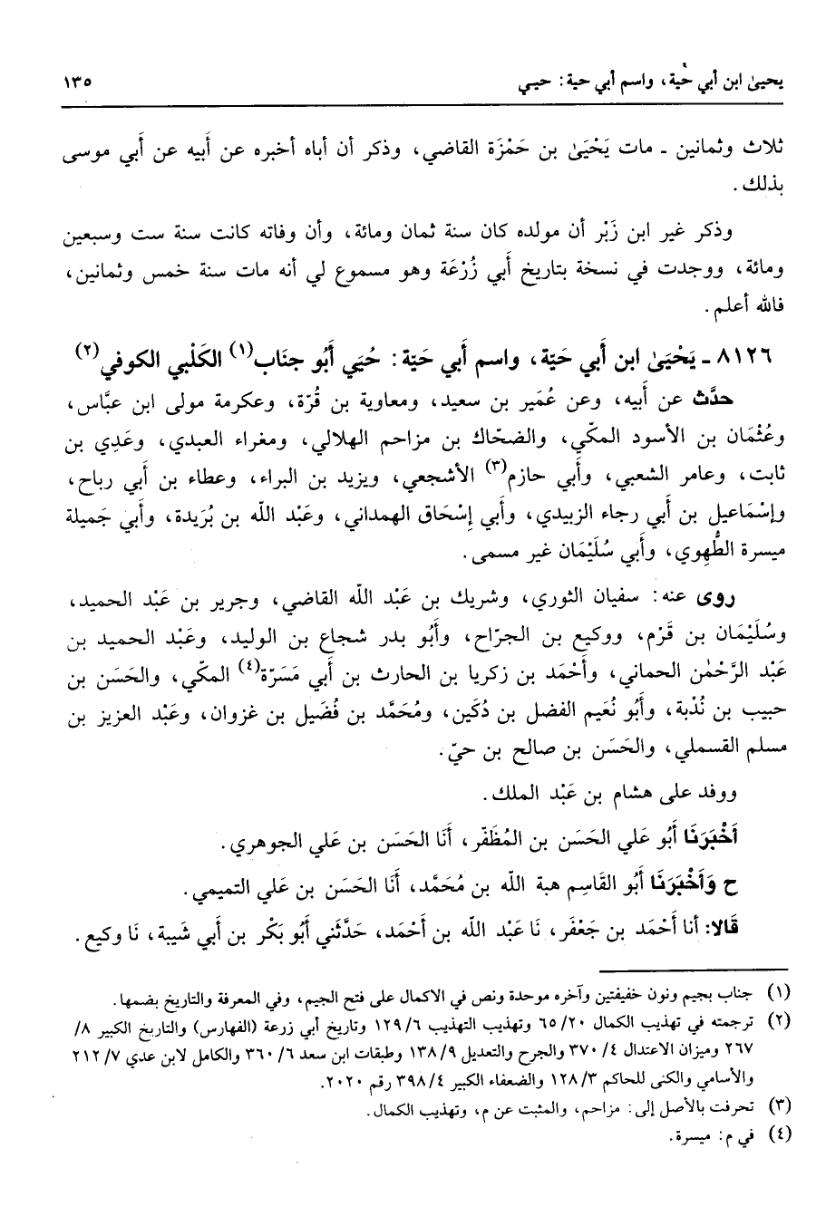 8126 - يحيى ابن أبي حية واسم أبي حية حيي أبو جناب (1) الكلبي الكوفي (2) حدث عن أبيه وعن عمير بن سعيد ومعاوية بن قرة وعكرمة مولى ابن عباس وعثمان بن الأسود المكي والضحاك بن مزاحم الهلالي ومغراء العبدي وعدي بن ثابت وعامر الشعبي وأبي حازم (3) الإشجعي ويزيد بن البراء وعطاء بن أبي رباح وإسماعيل بن أبي رجاء الزبيدي وأبي إسحاق الهمداني وعبد الله بن بريدة وأبي جميلة ميسرة الطهوي وأبي سليمان غير مسمى روى عنه سفيان الثوري وشريك بن عبد الله القاضي وجرير بن عبد الحميد وسليمان بن قرم ووكيع بن الجراح وأبو بدر شجاع بن الوليد وعبد الحميد بن عبد الرحمن الحماني وأحمد بن زكريا بن الحارث بن أبي مسرة (4) المكي والحسن بن حبيب بن ندبة وأبو نعيم الفضل بن دكين ومحمد بن فضيل بن غزوان وعبد العزيز بن مسلم القسملي والحسن بن صالح بن حي ووفد على هشام بن عبد الملك أخبرنا أبو علي الحسن بن المظفر أنا الحسن بن علي الجوهري ح وأخبرنا أبو القاسم هبة الله بن محمد أنا الحسن بن علي التميمي قالا أنا أحمد بن جعفر نا عبد الله بن أحمد حدثني أبو بكر بن أبي شيبة نا وكيع