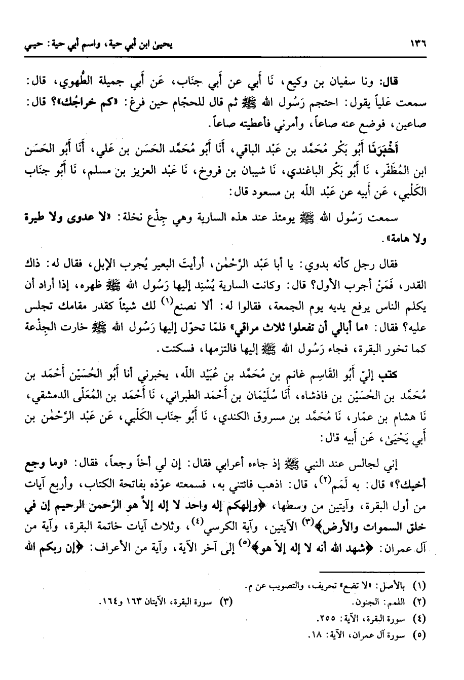 قال ونا سفيان بن وكيع نا أبي عن أبي جناب عن أبي جميلة الطهوي قال سمعت عليا يقول احتجم رسول الله (صلى الله عليه وسلم) ثم قال للحجام حين فرغ كم خراجك قال صاعين فوضع عنه صاعا وأمرني فأعطيته صاعا أخبرنا أبو بكر محمد بن عبد الباقي أنا أبو محمد الحسن بن علي أنا أبو الحسن ابن المظفر نا أبو بكر الباغندي نا شيبان بن فروخ نا عبد العزيز بن مسلم نا أبو جناب الكلبي عن أبيه عن عبد الله بن مسعود قال سمعت رسول الله (صلى الله عليه وسلم) يومئذ عند هذه السارية وهي جذع نخلة لا عدوى ولا طيرة ولا هامة فقال رجل كأنه بدوي يا أبا عبد الرحمن أرأيت البعير يجرب الإبل فقال له ذاك القدر فمن أجرب الأول قال وكانت السارية يسند إليها رسول الله (صلى الله عليه وسلم) ظهره إذا أراد أن يكلم الناس يرفع يديه يوم الجمعة فقالوا له ألا نصنع (1) لك شيئا كقدر مقامك تجلس عليه فقال ما أبالي أن تفعلوا ثلاث مراقي فلما تحول إليها رسول الله (صلى الله عليه وسلم) خارت الجذعة كما تخور البقرة فجاء رسول الله (صلى الله عليه وسلم) إليها فالتزمها فسكتت كتب إلي أبو القاسم غانم بن محمد بن عبيد الله يخبرني أنا أبو الحسين أحمد بن محمد بن الحسين بن فاذشاه أنا سليمان بن أحمد الطبراني نا أحمد بن المعلى الدمشقي نا هشام بن عمار نا محمد بن مسروق الكندي نا أبو جناب الكلبي عن عبد الرحمن بن أبي يحيى عن أبيه قال إني لجالس عند النبي (صلى الله عليه وسلم) إذ جاءه أعرابي فقال إن لي أخا وجعا فقال وما وجع أخيك قال به لمم (2) قال اذهب فائتني به فسمعته عوذه بفاتحة الكتاب وأربع آيات من أول البقرة وآيتين من وسطها " وإلهكم إله واحد لا إله إلا هو الرحمن الرحيم إن في خلق السموات والأرض " (3) الآيتين وآية الكرسي (4) وثلاث آيات خاتمة البقرة وآية من آل عمران " شهد الله أنه لا إله إلا هو " (5) إلى آخر الآية وآية من الأعراف " إن ربكم الله