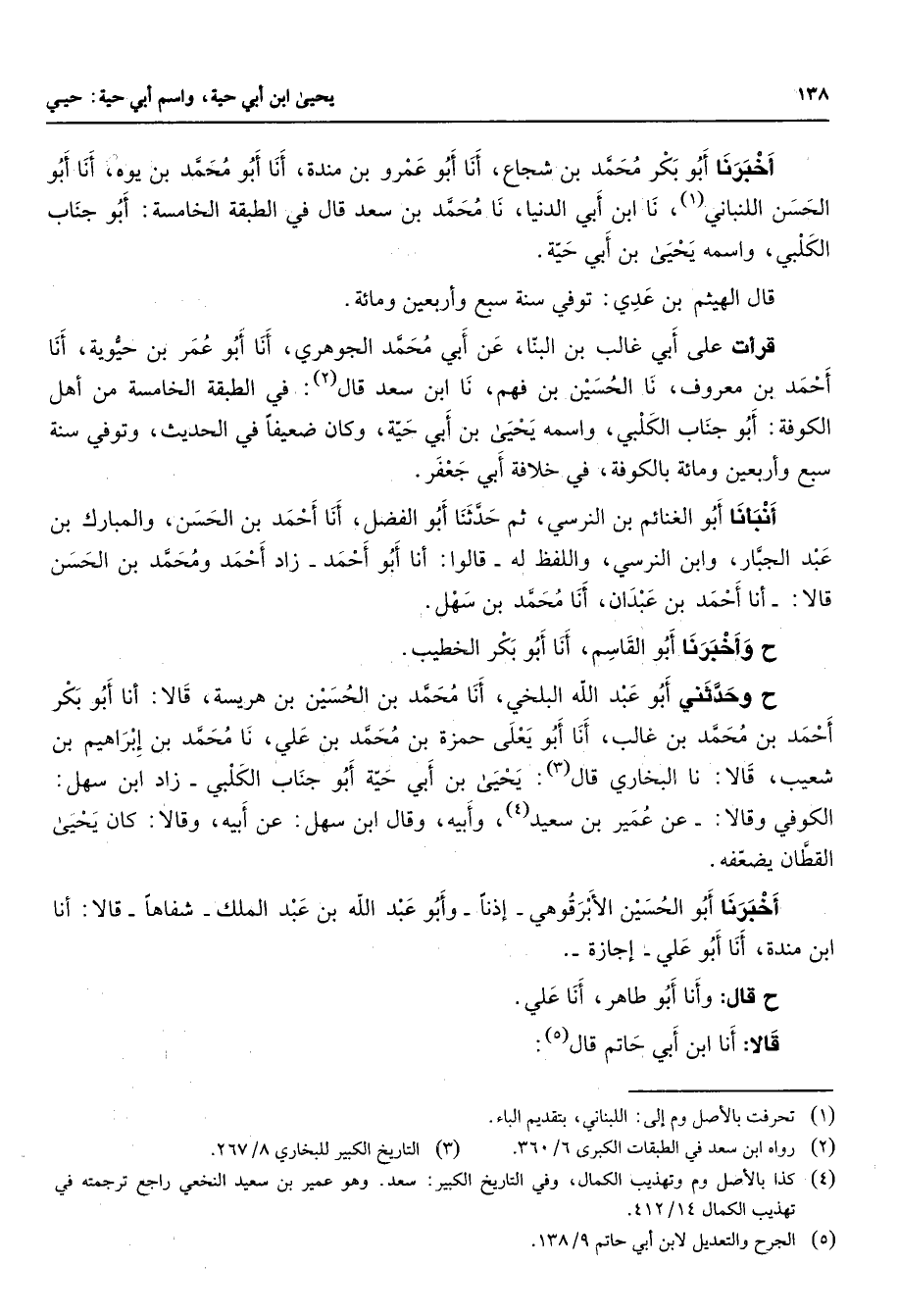 اخبرنا أبو بكر محمد بن شجاع أنا أبو عمرو بن مندة أنا أبو محمد بن يوه أنا أبو الحسن اللنباني (1) نا ابن أبي الدنيا نا محمد بن سعد قال في الطبقة الخامسة أبو جناب الكلبي واسمه يحيى بن أبي حية قال الهيثم بن عدي توفي سنة سبع وأربعين ومائة قرأت على أبي غالب بن البنا عن أبي محمد الجوهري أنا أبو عمر بن حيوية أنا أحمد بن معروف نا الحسين بن فهم نا ابن سعد قال (2) في الطبقة الخامسة من أهل الكوفة أبو جناب الكلبي واسمه يحيى بن أبي حية وكان ضعيفا في الحديث وتوفي سنة سبع وأربعين ومائة بالكوفة في خلافة أبي جعفر أنبأنا أبو الغنائم بن النرسي ثم حدثنا أبو الفضل أنا أحمد بن الحسن والمبارك بن عبد الجبار وابن النرسي واللفظ له قالوا أنا أبو أحمد زاد أحمد ومحمد بن الحسن قالا أنا أحمد بن عبدان أنا محمد بن سهل ح وأخبرنا أبو القاسم أنا أبو بكر الخطيب ح وحدثني أبو عبد الله البلخي أنا محمد بن الحسين بن هريسة قالا أنا أبو بكر أحمد بن محمد بن غالب أنا أبو يعلى حمزة بن محمد بن علي نا محمد بن إبراهيم بن شعيب قالا نا البخاري قال (3) يحيى بن أبي حية أبو جناب الكلبي زاد ابن سهل الكوفي وقالا عن عمير بن سعيد (4) وأبيه وقال ابن سهل عن ابيه وقالا كان يحيى القطان يضعفه أخبرنا أبو الحسين الأبرقوهي إذنا وأبو عبد الله بن عبد الملك شفاها قالا أنا ابن مندة أنا أبو علي إجازة ح قال وأنا أبو طاهر أنا علي قالا أنا ابن أبي حاتم قال (5)