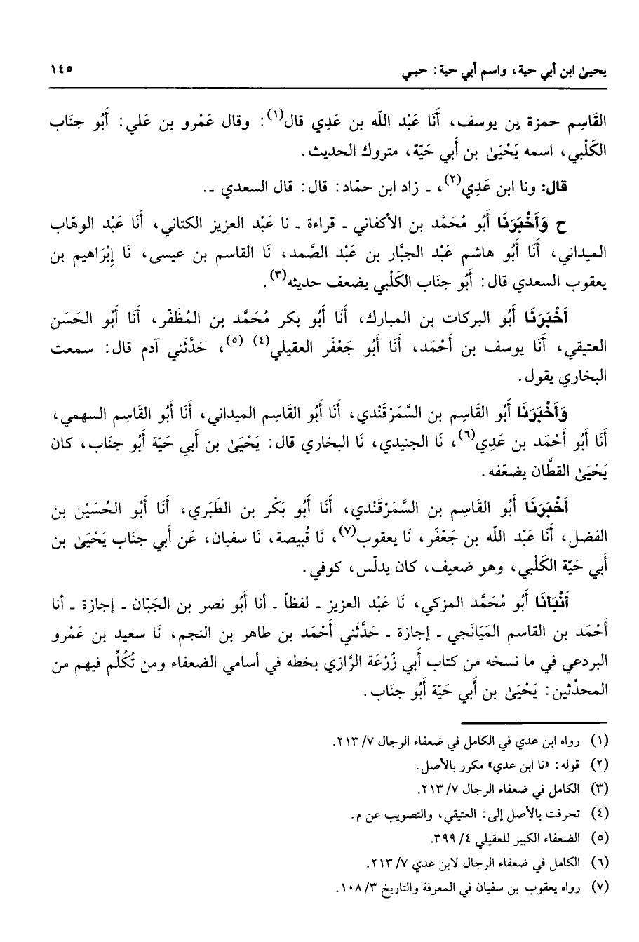 القاسم حمزة بن يوسف أنا عبد الله بن عدي قال (1) وقال عمرو بن علي أبو جناب الكلبي اسمه يحيى بن أبي حية متروك الحديث قال ونا ابن عدي (2) زاد ابن حماد قال قال السعدي ح وأخبرنا أبو محمد بن الأكفاني قراءة نا عبد العزيز الكتاني أنا عبد الوهاب الميداني أنا أبو هاشم عبد الجبار بن عبد الصمد نا القاسم بن عيسى نا إبراهيم بن يعقوب السعدي قال أبو جناب الكلبي يضعف حديثه (3) أخبرنا أبو البركات بن المبارك أنا أبو بكر محمد بن المظفر أنا أبو الحسن العتيقي أنا يوسف بن أحمد أنا أبو جعفر العقيلي (4) (5) حدثني آدم قال سمعت البخاري يقول أخبرنا أبو القاسم بن السمرقندي أنا أبو القاسم الميداني أنا أبو القاسم السهمي أنا أبو أحمد بن عدي (6) نا الجنيدي نا البخاري قال يحيى بنابي حية أبو جناب كان يحيى القطان يضعفه وأخبرنا أبو القاسم بن السمرقندي أنا أبو بكر بن الطبري أنا أبو الحسين بن الفضل أنا عبد الله بن جعفر نا يعقوب (7) نا قبيصة نا سفيان عن أبي جناب يحيى بن أبي حية الكلبي وهو ضعيف كان يدلس كوفي أنبأنا أبو محمد المزكي نا عبد العزيز لفظا أنا أبو نصر بن الجبان إجازة أنا أحمد بن القاسم الميانجي إجازة حدثني أحمد بن طاهر بن النجم نا سعيد بن عمرو البردعي في ما نسخه من كتاب أبي زرعة الرازي بخطه في أسامي الضعفاء ومن تكلم فيهم من المحدثين يحيى بن أبي حية أبو جناب