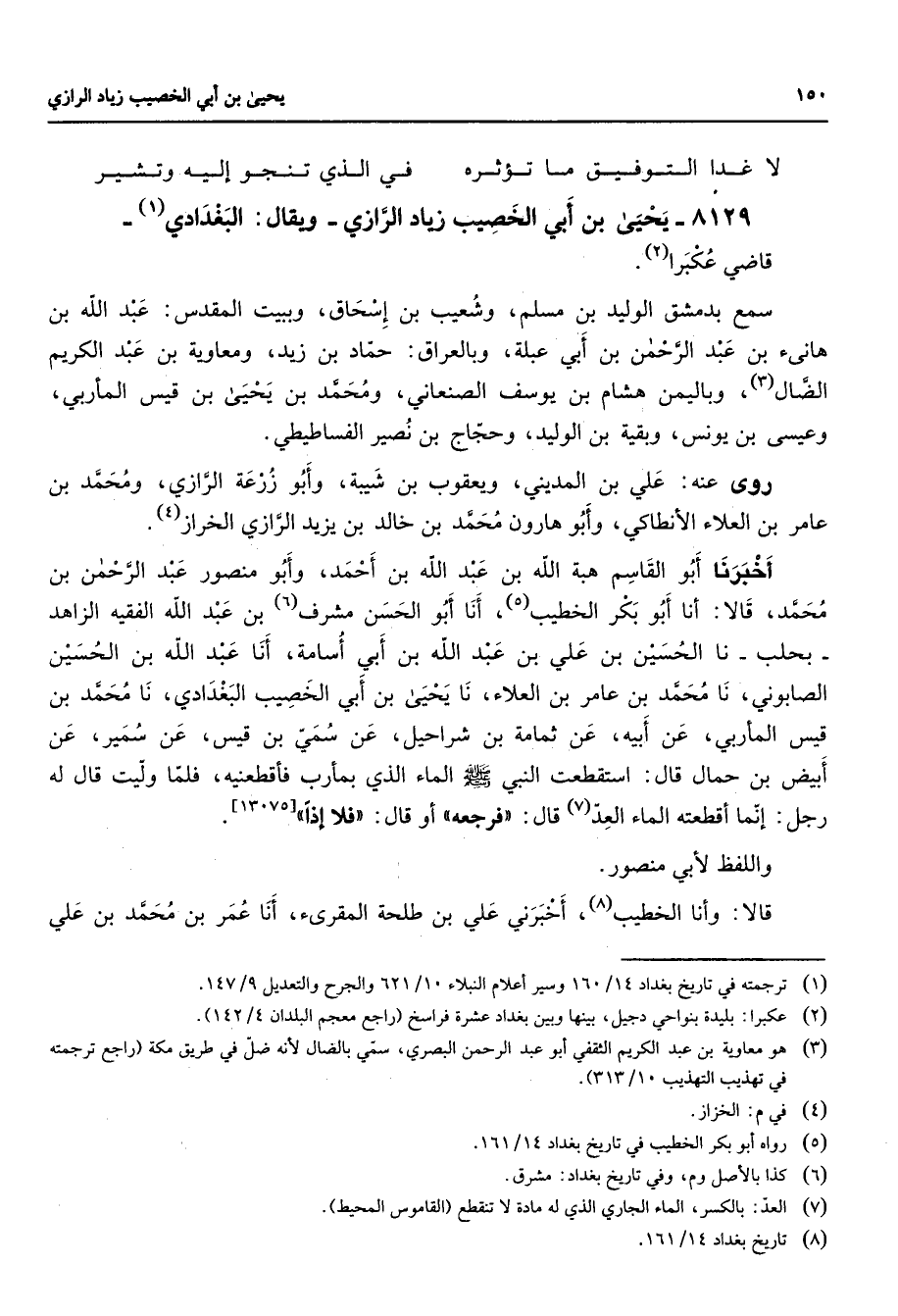 8129 - يحيى بنأبي الخصيب زياد الرازي ويقال البغدادي (1) قاضي عكبرا (2) سمع بدمشق الوليد بن مسلم وشعيب بن إسحاق وببيت المقدس عبد الله بن هانئ بن عبد الرحمن بن أبي عبلة وبالعراق حماد بن زيد ومعاوية بن عبد الكريم الضال (3) وباليمن هشام بن يوسف الصنعاني ومحمد بن يحيى بن قيس المأربي وعيسى بن يونس وبقية بن الوليد وحجاج بن نصير الفساطيطي روى عنه علي بن المديني ويعقوب بن شيبة وأبو زرعة الرازي ومحمد بن عامر بن العلاء الأنطاكي وأبو هارون محمد بن خالد بن يزيد الرازي الخراز (4) أخبرنا أبو القاسم هبة الله بن عبد الله بن أحمد وأبو منصور عبد الرحمن بن محمد قالا أنا أبو بكر الخطيب (5) أنا أبو الحسن مشرف (6) بن عبد الله الفقيه الزاهد بحلب نا الحسين بن علي بن عبد الله بن أبي أسامة أنا عبد الله بن الحسين الصابوني نا محمد بن عامر بن العلاء نا يحيى بن أبي الخصيب البغداي نا محمد بن قيس المأربي عن أبيه عن ثمامة بن شراحيل عن سمي بن قيس عن سمير عن أبيض بن حمال قال استقطعت النبي (صلى الله عليه وسلم) الماء الذي بمأرب فأقطعنيه فلما وليت قال له رجل إنما أقطعته الماء العد (7) قال فرجعه أو قال فلا إذا