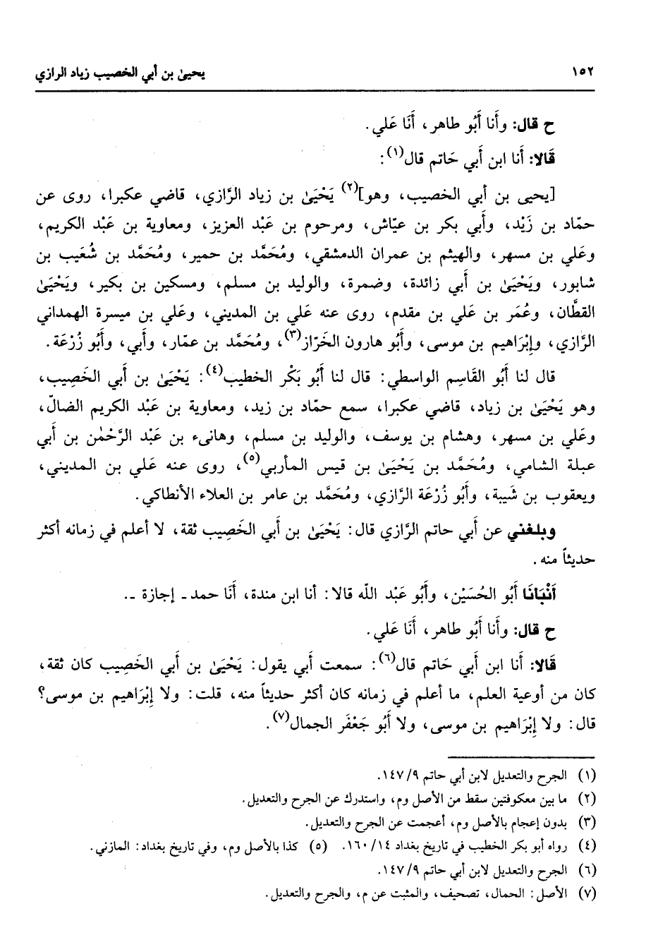 ح قال وأنا أبو طاهر أنا علي قالا أنا ابن أبي حاتم قال (1) يحيى بن أبي الخصيب وهو (2) يحيى بن زياد الرازي قاضي عكبرا روى عن حماد بن زيد وأبي بكر بن عياش ومرحوم بن عبد العزيز ومعاوية بن عبد الكريم وعلي بن مسهر والهيثم بن عمران الدمشقي ومحمد بن حمير ومحمد بن شعيب بن شابور ويحيى بنأبي زائدة وضمرة والوليد بن مسلم ومسكين بن بكير ويحيى القطان وعمر بن علي بن مقدم روى عنه علي بن المديني وعلي بن ميسرة الهمداني الرازي وإبراهيم بن موسى وأبو هارون الخراز (3) ومحمد بن عمار وأبي وأبو زرعة قال لنا أبو القاسم الواسطي قال لنا أبو بكر الخطيب (4) يحيى بنأبي الخصيب وهو يحيى بن زياد قاضي عكبرا سمع حماد بن زيد ومعاوية بن زيد بن عبد الكريم الضال وعلي بن مسهر وهشام بن يوسف والوليد بن مسلم وهانئ بن عبد الرحمن بن أبي عبلة الشامي ومحمد بن يحيى بن قيس المأربي (5) روى عنه علي بن المديني ويعقوب بن شيبة وأبو زرعة الرازي ومحمد بن عامر بن العلاء الأنطاكي وبلغني عن أبي حاتم الرازي قال يحيى بن أبي الخصيب ثقة لا أعلم في زمانه أكثر حديثا منه أنبأنا أبو الحسين وابو عبد الله قالا أنا ابن مندة أنا حمد إجازة ح قال وأنا أبو طاهر أنا علي قالا انا ابن أبي حاتم قال (6) سمعت أبي يقول يحيى بنأبي الخصيب كان ثقة كان من أوعية العلم في ما أعلم في زمانه كان أكثر حديثا منه قلت ولا إبراهيم بن موسى قال ولا إبراهيم بن موسى ولا أبو جعفر الجمال (7)