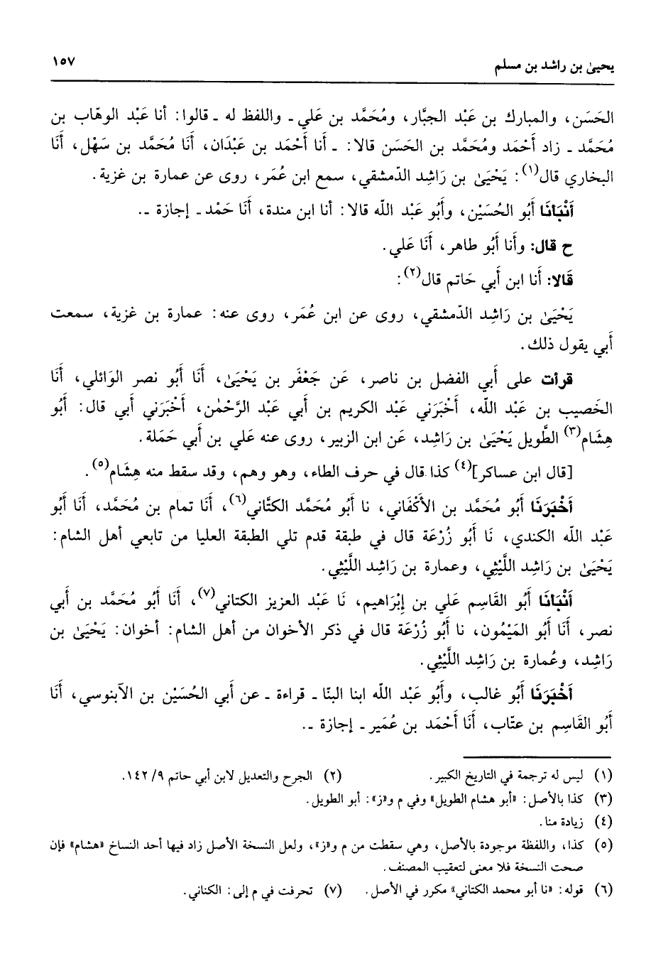 الحسن والمبارك بن عبد الجبار ومحمد بن علي واللفظ له قالوا أنا عبد الوهاب بن محمد زاد أحمد ومحمد بن الحسن قالا أنا أحمد بن عبدان أنا محمد بن سهل أنا البخاري قال (1) يحيى بن راشد الدمشقي سمع ابن عمر روى عن عمارة بن غزية أنبأنا أبو الحسين وأبو عبد الله قالا أنا ابن مندة أنا حمد إجازة ح قال وأنا أبو طاهر أنا علي قالا أنا ابن أبي حاتم قال (2) يحيى بن راشد الدمشقي روى عن ابن عمر روى عنه عمارة بن غزية سمعت أبي يقول ذلك قرأت على أبي الفضل بن ناصر عن جعفر بن يحيى أنا أبو نصر الوائلي أنا الخصيب بن عبد الله أخبرني عبد الكريم بن أبي عبد الرحمن أخبرني أبي قال أبو هشام (3) الطويل يحيى بن راشد عن ابن الزبير روى عنه علي بن أبي حملة قال ابن عساكر (4) كذا قال في حرف الطاء وهو وهم وقد سقط منه هشام (5) أخبرنا أبو محمد بن الأكفاني نا أبو محمد الكتاني (6) أنا تمام بن محمد أنا أبو عبد الله الكندي نا أبو زرعة قال في طبقة قدم تلي الطبقة العليا من تابعي أهل الشام يحيى بن راشد الليثي وعمارة بن راشد الليثي أنبأنا أبو القاسم علي بن إبراهيم نا عبد العزيز الكتاني (7) أنا أبو محمد بنأبي نصر أنا أبو الميمون نا أبو زرعة قال في ذكر الأخوان من أهل الشام أخوان يحيى بن راشد وعمارة بن راشد الليثي أخبرنا أبو غالب وأبو عبد الله ابنا البنا قراءة عن أبي الحسين بن الآبنوسي أنا أبو القاسم بن عتاب أنا أحمد بن عمير إجازة