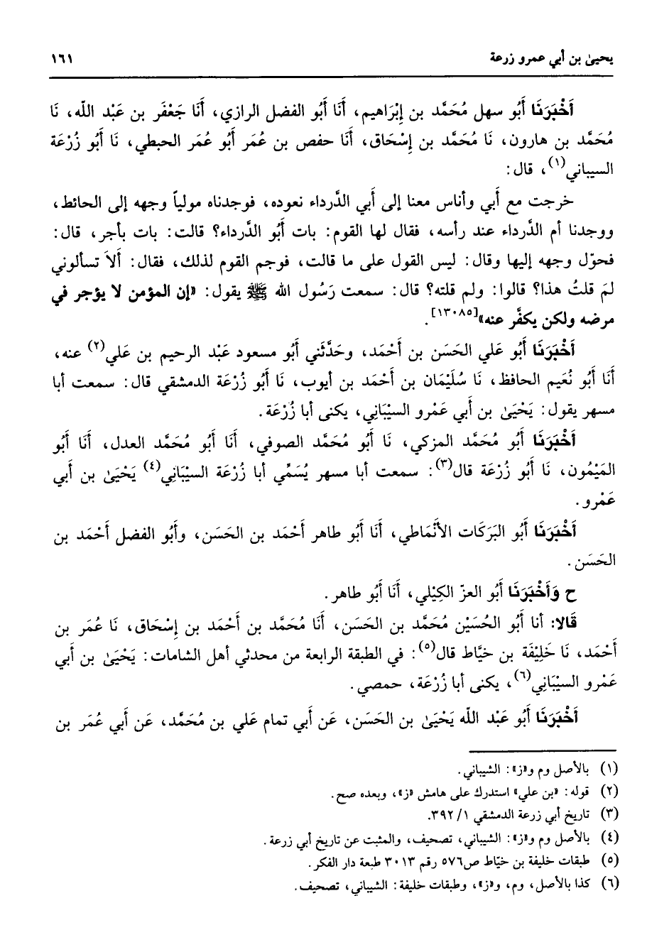 [13085] أخبرنا أبو علي الحسن بن أحمد وحدثني أبو مسعود عبد الرحيم بن علي (2) عنه أنا أبو نعيم الحافظ نا سليمان بن أحمد بن أيوب نا أبو زرعة الدمشقي قال سمعت أبا مسهر يقول يحيى بن أبي عمرو السيباني يكنى أبا زرعة أخبرنا أبو محمد المزكي نا أبو محمد الصوفي أنا أبو محمد العدل أنا أبو الميمون نا أبو زرعة قال (3) سمعت أبا مسهر يسمي أبا زرعة السيباني (4) يحيى بن أبي عمرو أخبرنا أبو البركات الأنماطي أنا أبو طاهر أحمد بن الحسن وأبو الفضل أحمد بن الحسن ح وأخبرنا أبو العز الكيلي أنا أبو طاهر قالا أنا أبو الحسين محمد بن الحسن أنا محمد بن أحمد بن إسحاق نا عمر بن أحمد نا خليفة بن خياط قال (5) في الطبقة الرابعة من محدثي أهل الشامات يحيى بن أبي عمرو السيباني (6) يكنى أبا زرعة حمصي أخبرنا أبو عبد الله يحيى بن الحسن عن أبي تمام علي بن محمد عن أبي عمر بن