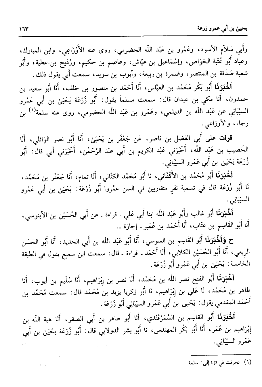 وأبي سلام الأسود وعمرو بن عبد الله الحضرمي روى عنه الأوزاعي وابن المبارك وعباد أبو عتبة الخواص وإسماعيل بن عياش وعاصم بن حكيم ورديح بن عطية وأبو شعبة صدقة بن المنتصر وضمرة بن ربيعة وأيوب بن سويد سمعت أبي يقول ذلك أخبرنا أبو بكر محمد بن العباس أنا أحمد بن منصور بن خلف أنا أبو سعيد بن حمدون أنا مكي بن عبدان قال سمعت مسلما يقول أبو زرعة يحيى بن أبي عمرو السيباني عن عبد الله بن الديلمي وعمرو بن عبد الله الحضرمي روى عنه سلمة (1) بن رجاء والأوزاعي قرأت على أبي الفضل بن ناصر عن جعفر بن يحيى أنا أبو نصر الوائلي أنا الخصيب بن عبد الله أخبرني عبد الكريم بنأبي عبد الرحمن أخبرني أبي قال أبو زرعة يحيى بنأبي عمرو السيباني أخبرنا أبو محمد بن الأكفاني نا أبو محمد الكتاني أنا تمام أنا جعفر بن محمد نا أبو زرعة قال في تسمية نفر متقاربين في السن عمروا أبو زرعة يحيى بن أبي عمرو السيباني أخبرنا أبو غالب وأبو عبد الله ابنا أبي علي قراءة عن أبي الحسين بن الآبنوسي أنا أبو القاسم بن عتاب أنا أحمد بن عمير إجازة ح وأخبرنا أبو القاسم بن السوسي أنا أبو عبد الله بن أبي الحديد أنا أبو الحسن الربعي أنا أبو الحسين الكلابي أنا أحمد قراءة قال سمعت ابن سميع يقول في الطبقة الخامسة يحيى بن أبي عمرو أبو زرعة أخبرنا أبو الفتح نصر الله محمد أنا نصر بن إبراهيم أنا سليم بن أيوب أنا طاهر بن محمد نا علي بن إبراهيم نا أبو زكريا يزيد بن محمد قال سمعت محمد بن أحمد المقدمي يقول يحيى بن أبي عمرو السيباني أبو زرعة أخبرنا أبو القاسم بن السمرقندي أنا أبو طاهر بن أبي الصقر أنا هبة الله بن إبراهيم بن عمر أنا أبو بكر المهندس نا أبو بشر الدولابي قال أبو زرعة يحيى بن أبي عمرو السيباني