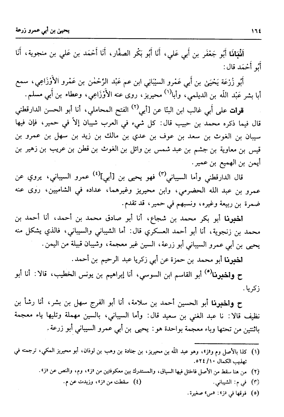 أنبأنا أبو جعفر بن أبي علي أنا أبو بكر الصفار أنا أحمد بن علي بن منجوية أنا أبو أحمد قال أبو زرعة يحيى بن أبي عمرو السيباني ابن عم عبد الرحمن بن عمرو الأوزاعي سمع أبا بشر عبد الله بن الديلمي وأبا (1) محيريز روى عنه الأوزاعي وعطاء بن أبي مسلم قرأت على أبي غالب ابن البنا عن أبي (2) الفتح المحاملي أنا أبو الحسن الدارقطني قال فيما ذكره محمد بن حبيب قال كل شئ في العرب شيبان إلا في حمير فإن فيها سيبان بن الغوث بن سعد بن عوف بن عدي بن مالك بن زيد بن سهل بن عمرو بن قيس بن معاوية بن جشم بن عبد شمس بن وائل بن الغوث بن قطن بن عريب بن زهير بن أيمن بن الهميع بن عمير قال الدارقطني وأما السيباني (3) فهو يحيى بن أبي (4) عمرو السيباني يروي عن عمرو بن عبد الله الحضرمي وابن محيريز وغيرهما عداده في الشاميين روى عنه ضمرة بن ربيعة وغيره ونسبهم في حمير قد تقدم أخبرنا أبو بكر محمد بن شجاع أنا أبو صادق محمد بن أحمد أنا أحمد بن محمد بن زنجوية أنا أبو أحمد العسكري قال أما الشيباني والسيباني فالذي يشكل منه يحيى بن أبي عمرو السيباني أبو زرعة السين غير معجمة وشيبان قبيلة من اليمن أخبرنا أبو محمد بن حمزة عنأبي زكريا عبد الرحيم بن أحمد ح وأخبرنا (5) أبو القاسم ابن السوسي أنا إبراهيم بن يونس الخطيب قالا أنا أبو زكريا ح وأخبرنا أبو الحسين أحمد بن سلامة أنا أبو الفرج سهل بن بشر أنا رشأ بن نظيف قالا نا عبد الغني بن سعيد قال وأما السيباني بالسين مهملة وتليها ياء معجمة باثنتين من تحتها وباء معجمة بواحدة هو يحيى بنأبي عمرو السيباني أبو زرعة