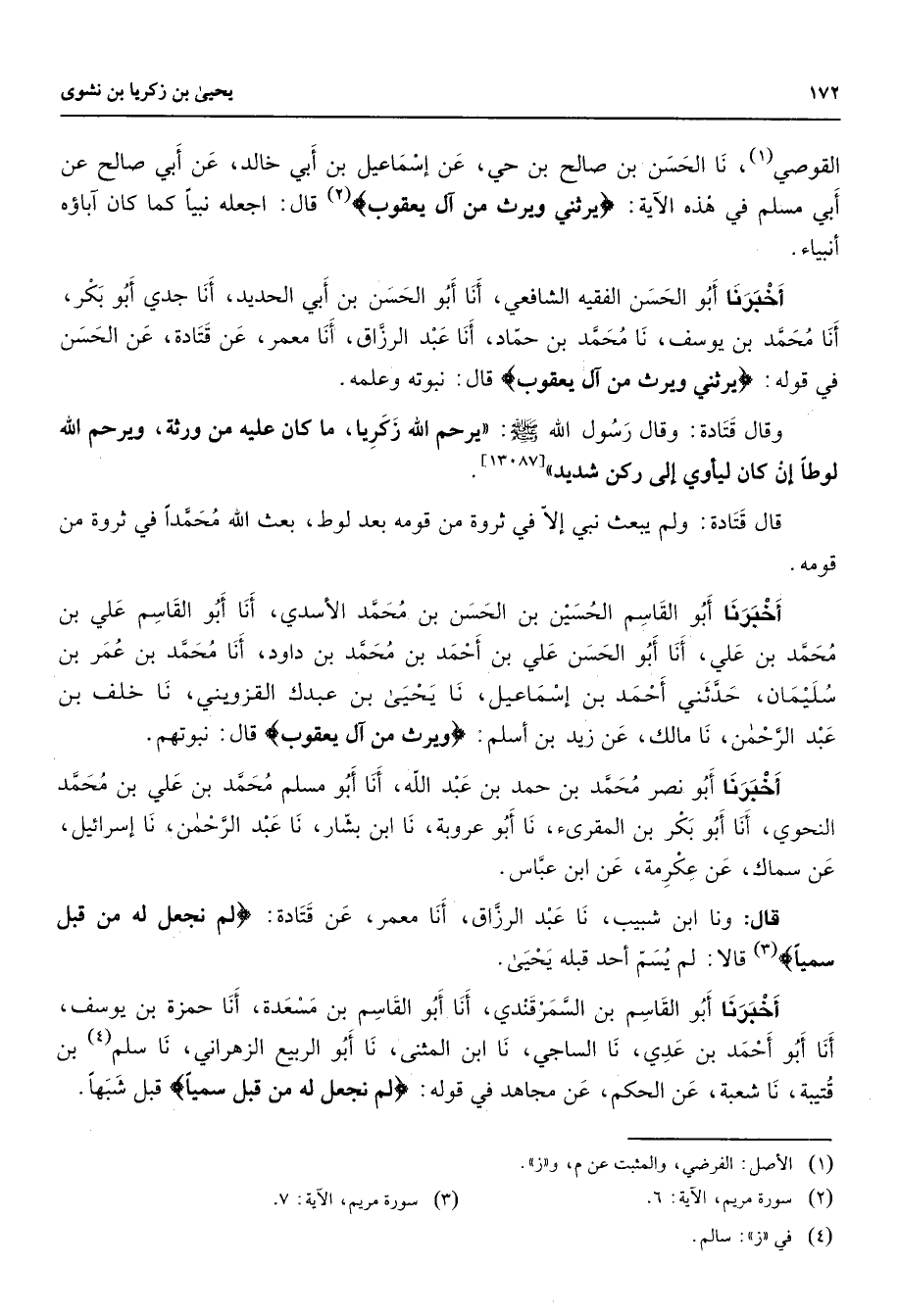 [13087] قال قتادة ولم يبعث نبي إلا في ثروة من قومه بعد لوط بعث الله محمدا في ثروة من قومه أخبرنا أبو القاسم الحسين بن الحسن بن محمد الأسدي أنا أبو القاسم علي بن محمد بن علي أنا أبو الحسن علي بن أحمد بن محمد بن داود أنا محمد بن عمر بن سليمان حدثني أحمد بن إسماعيل نا يحيى بن عبدك القزويني نا خلف بن عبد الرحمن نا مالك عن زيد بن أسلم " ويرث من آل يعقوب " قال نبوتهم أخبرنا أبو نصر محمد بن حمد بن عبد الله أنا أبو مسلم محمد بن علي بن محمد النحوي أنا أبو بكر بن المقرئ نا أبو عروبة نا ابن بشار نا عبد الرحمن نا إسرائيل عن سماك عن عكرمة عن ابن عباس قال ونا ابن شبيب نا عبد الرزاق أنا معمر عن قتادة " لم نجعل له من قبل سميا " (3) قالا لم يسم أحد قبله يحيى أخبرنا أبو القاسم بن السمرقندي أنا أبو القاسم بن مسعدة أنا حمزة بن يوسف أنا أبو أحمد بن عدي نا الساجي نا ابن المثنى نا أبو الربيع الزهراني نا سلم (4) بن قتيبة نا شعبة عن الحكم عن مجاهد في قوله " لم نجعل له من قبل سميا " قبل شبها