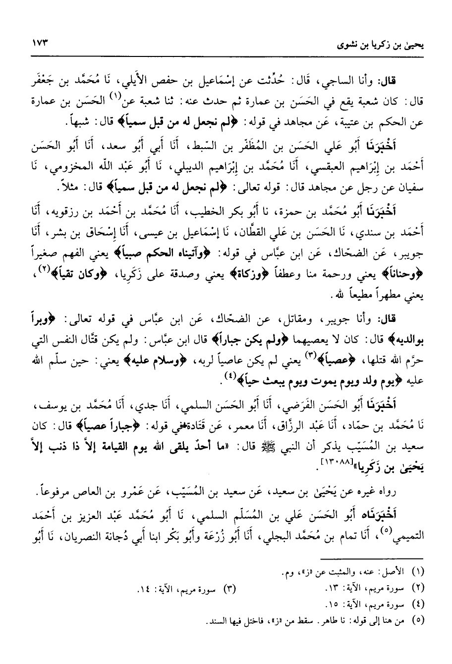 قال وأنا الساجي قال حدثت عن إسماعيل بن حفص الأيلي نا محمد بن جعفر قال كان شعبة يقع في الحسن بن عمارة ثم حدث عنه ثنا شعبة عن (1) الحسن بن عمارة عن الحكم بن عتيبة عن مجاهد في قوله (لم نجعل له من قبل سميا) قال شبها أخبرنا أبو علي الحسن بن المظفر بن السبط أنا أبي أبو سعد أنا أبو الحسن أحمد بن إبراهيم العبقسي أنا محمد بن إبراهيم الديبلي نا أبو عبد الله المخزومي نا سفيان عن رجل عن مجاهد قال قوله تعالى " لم نجعل له من قبل سميا " قال مثلا أخبرنا أبو محمد بن حمزة نا أبو بكر الخطيب أنا محمد بن أحمد بن رزقويه أنا أحمد بن سندي نا الحسن بن علي القطان نا إسماعيل بن عيسى أنا إسحاق بن بشر أنا جويبر عن الضحاك عن ابن عباس في قوله " وآتيناه الحكم صبيا " يعني الفهم صغيرا " وحنانا " يعني ورحمة منا وعطفا " وزكاة " يعني وصدقة على زكريا " وكان تقيا " (2) يعني مطهرا مطيعا لله قال وأنا جويبر ومقاتل عن الضحاك عن ابن عباس في قوله تعالى " وبرا بوالديه " قال كان لا يعصيهما " ولم يكن جبارا " قال ابن عباس ولم يكن قتال النفس التي حرم الله قتلها " عصيا " (3) يعني لم يكن عاصيا لربه " وسلام عليه " يعني حين سلم الله عليه " يوم ولد ويوم يموت ويوم يبعث حيا " (4) أخبرنا أبو الحسن الفرضي أنا أبو الحسن السلمي أنا جدي أنا محمد بن يوسف نا محمد بن حماد أنا عبد الرزاق أنا معمر عن قتادة في قوله " جبارا عصيا " قال كان سعيد بن المسيب يذكر أن النبي (صلى الله عليه وسلم) قال ما أحد يلقى الله يوم القيامة إلا ذا ذنب إلا يحيى بن