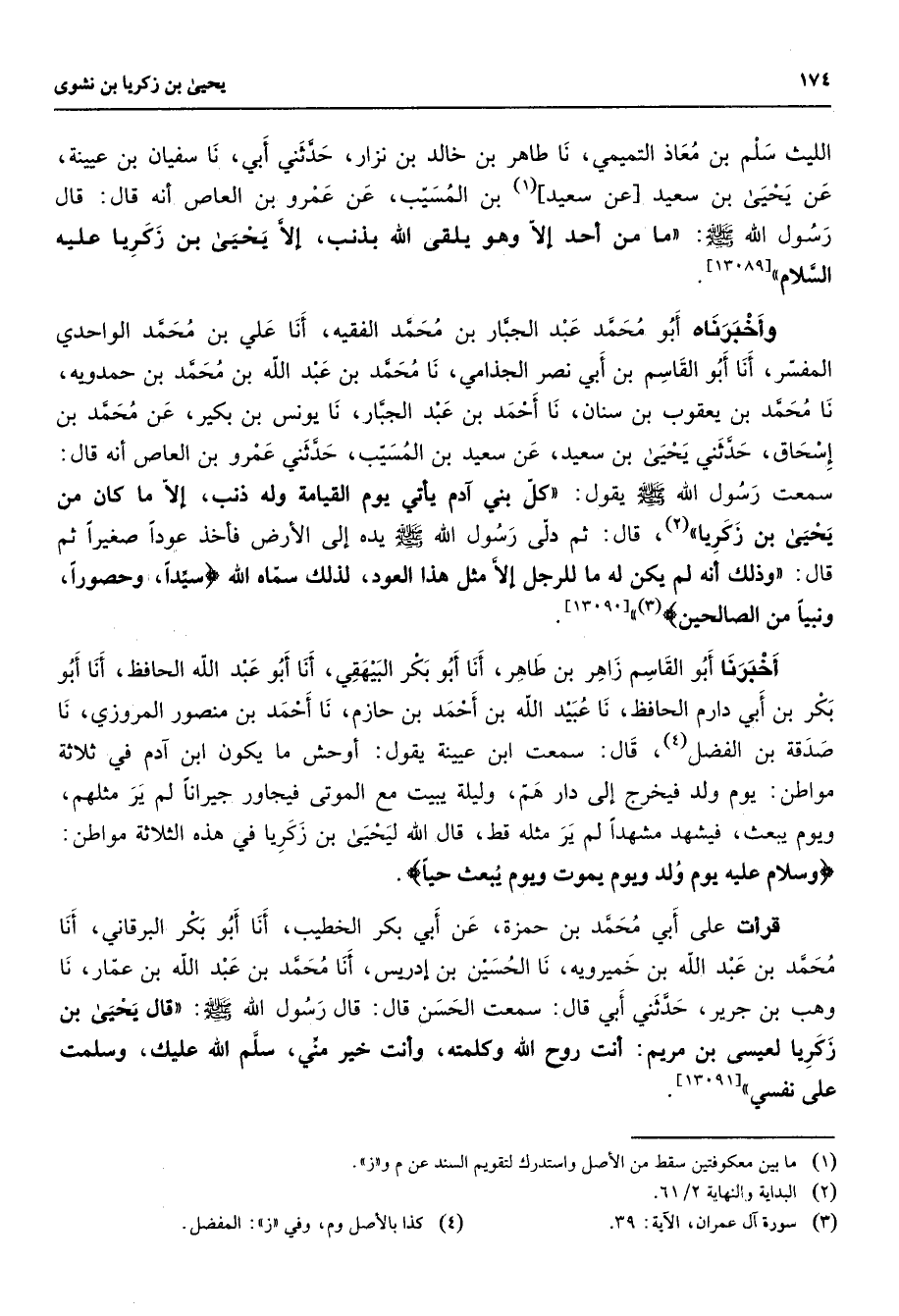 [13089] وأخبرناه أبو محمد عبد الجبار بن محمد الفقيه أنا علي بن محمد الواحدي المفسر أنا أبو القاسم بن أبي نصر الجذامي نا محمد بن عبد الله بن محمد بن حمدويه نا محمد بن يعقوب بن سنان نا أحمد بن عبد الجبار نا يونس بن بكير عن محمد بن إسحاق حدثني يحيى بن سعيد عن سعيد بن المسيب حدثني عمرو بن العاص أنه قال سمعت رسول الله (صلى الله عليه وسلم) يقول كل بني آدم يأتي يوم القيامة وله ذنب إلا من كان من يحيى بن زكريا (2) قال ثم دلى رسول الله (صلى الله عليه وسلم) يده إلى الأرض فأخذ عودا صغيرا ثم قال وذلك أنه لم يكن له ما للرجل إلا مثل هذا العود لذلك سماه الله سيدا وحصورا ونبيا من الصالحين (3)