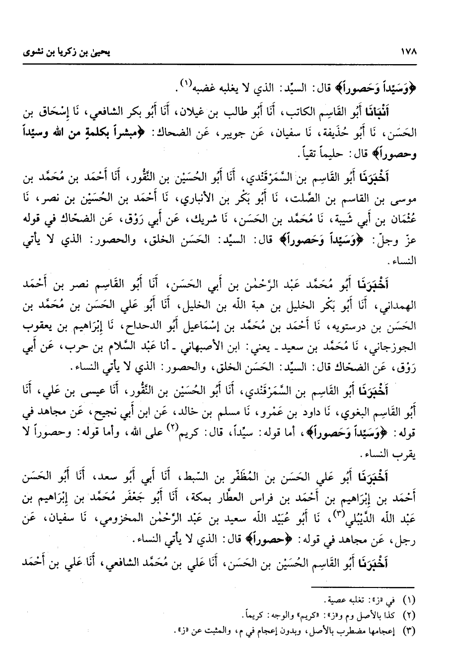" وسيدا وحصورا " قال السيد الذي لا يغلبه غضبه (1) أنبأنا أبو القاسم الكاتب أنا أبو طالب بن غيلان أنا أبو بكر الشافعي نا إسحاق بن الحسن نا أبو حذيفة نا سفيان عن جويبر عن الضحاك " مبشرا بكلمة من الله وسيدا وحصورا " قال حليما تقيا أخبرنا أبو القاسم بن السمرقندي أنا أبو الحسين بن النقور أنا أحمد بن محمد بن موسى بن القاسم بن الصلت نا أبو بكر الأنباري نا أحمد بن الحسين بن نصر نا عثمان بن أبي شيبة نا محمد بن الحسن نا شريك عن أبي روق عن الضحاك في قوله عز وجل " وسيدا وحصورا " قال السيد الحسن الخلق والحصور الذي لا يأتي النساء أخبرنا أبو محمد عبد الرحمن بن أبي الحسن أنا أبو القاسم نصر بن أحمد الهمداني أنا أبو بكر الخليل بن هبة الله بن الخليل أنا أبو علي الحسن بن محمد بن الحسن بن درستويه نا أحمد بن محمد بن إسماعيل أبو الدحداح نا إبراهيم بن يعقوب الجوزجاني نا محمد بن سعيد يعني ابن الأصبهاني أنا عبد السلام بن حرب عن أبي روق عن الضحاك قال السيد الحسن الخلق والحصور الذي لا يأتي النساء أخبرنا أبو القاسم بن السمرقندي أنا أبو الحسين بن النقور أنا عيسى بن علي أنا أبو القاسم البغوي نا داود بن عمرو نا مسلم بن خالد عن ابن أبي نجيح عن مجاهد في قوله " وسيدا وحصورا " أما قوله سيدا قال كريم (2) على الله وأما قوله وحصورا لا يقرب النساء أخبرنا أبو علي الحسن بن المظفر بن السبط أنا أبي أبو سعد أنا أبو الحسن أحمد بن إبراهيم بن أحمد بن فراس العطار بمكة أنا أبو جعفر محمد بن إبراهيم بن عبد الله الديبلي (3) نا أبو عبيد الله سعيد بن عبد الرحمن المخزومي نا سفيان عن رجل عن مجاهد في قوله " حصورا " قال الذي لا يأتي النساء أخبرنا أبو القاسم الحسين بن الحسن أنا علي بن محمد الشافعي أنا علي بن أحمد