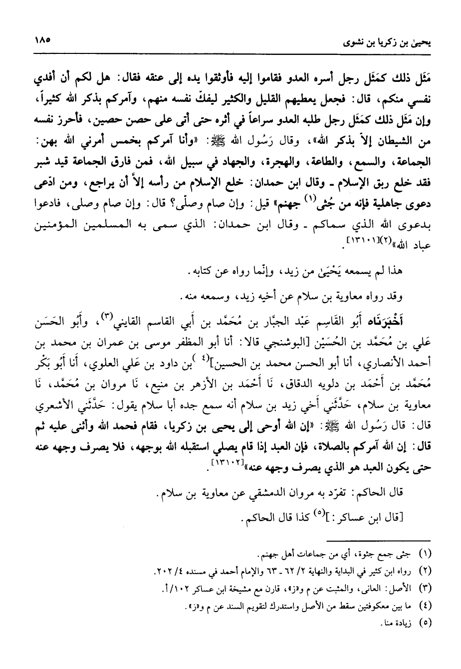 [13101] هذا لم يسمعه يحيى من زيد وإنما رواه عن كتابه وقد رواه معاوية بن سلام عن أخيه زيد وسمعه منه أخبرناه أبو القاسم عبد الجبار بن محمد بن أبي القاسم القايني (3) وأبو الحسن علي بن محمد بن الحسين البوشنجي قالا أنا أبو المظفر موسى بن عمران بن محمد بن أحمد الأنصاري أنا أبو الحسن محمد بن الحسين (4) بن داود بن علي العلوي أنا أبو بكر محمد بن أحمد بن دلويه الدقاق نا أحمد بن الأزهر بن منيع نا مروان بن محمد نا معاوية بن سلام حدثني أخي زيد بن سلام أنه سمع جده أبا سلام يقول حدثني الأشعري قال قال رسول الله (صلى الله عليه وسلم) إ ن الله أوحى إلى يحيى بن زكريا فقام فحمد الله وأثنى عليه ثم قال إن الله آمركم بالصلاة فإن العبد إذا قام يصلي استقبله الله بوجهه فلا يصرف وجهه عنه حتى يكون العبد هو الذي يصرف وجهه عنه