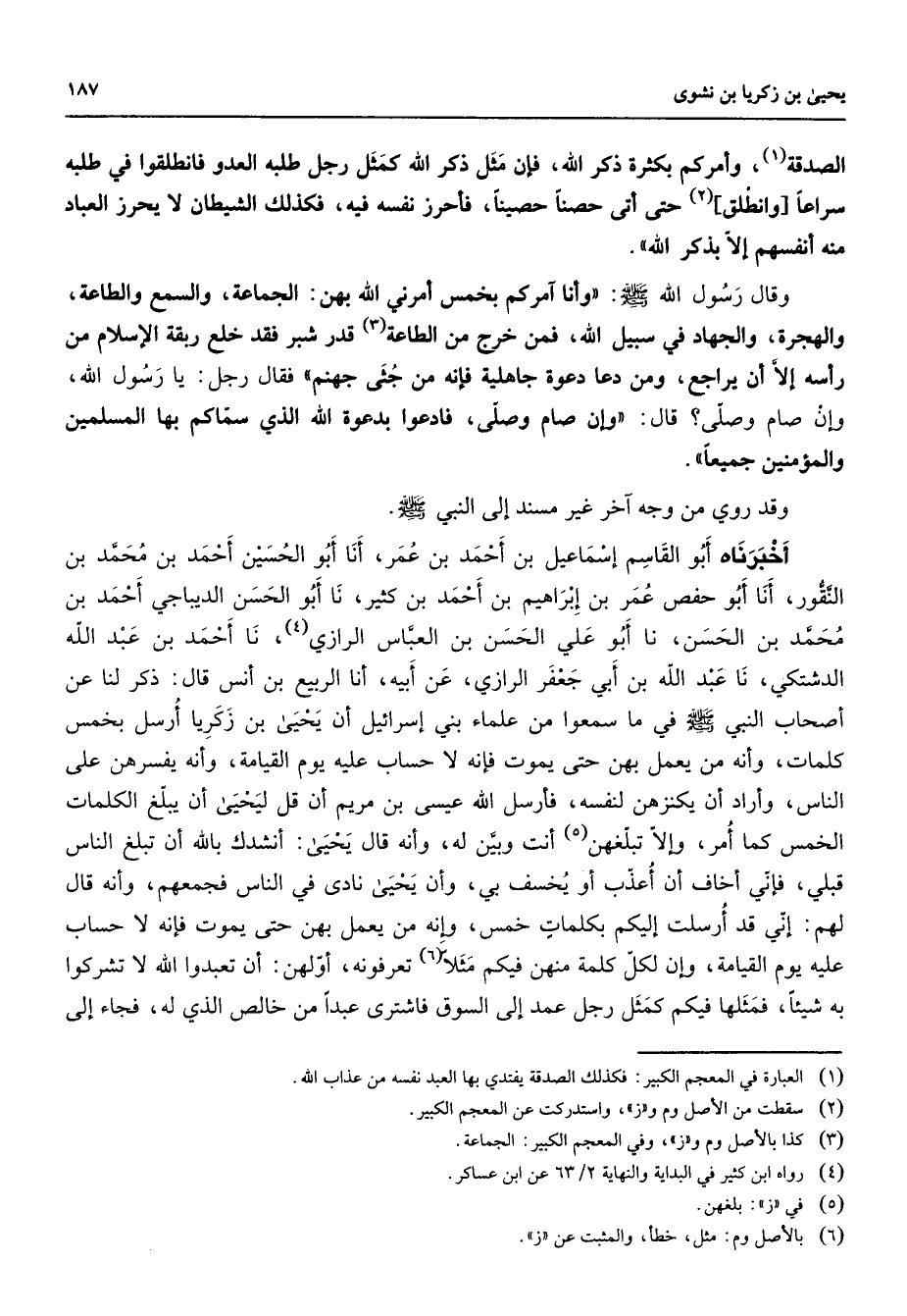 الصدقة (1) وأمركم بكثرة ذكر الله فإن مثل ذكر الله كمثل رجل طلبه العدو فانطلقوا في طلبه سراعا وانطلق (2) حتى أتى حصنا حصينا فأحرز نفسه فيه فكذلك الشيطان لا يحرز العباد منه أنفسهم إلا بذكر الله وقال رسول الله (صلى الله عليه وسلم) وأنا آمركم بخمس أمرني الله بهن الجماعة والسمع والطاعة والهجرة والجهاد في سبيل الله فمن خرج من الطاعة (3) قدر شبر فقد خلع ربقة الإسلام من رأسه إلا أن يراجع ومن دعا دعوة جاهلية فإنه من جثى جهنم فقال رجل يا رسول الله وإن صام وصلى قال وإن صام وصلى فادعوا بدعوة الله الذي سماكم بها المسلمين والمؤمنين جميعاح وقد روى من وجه آخر غير مسند إلى النبي (صلى الله عليه وسلم) أخبرناه أبو القاسم إسماعيل بن أحمد بن عمر أنا أبو الحسين أحمد بن محمد بن النقور أنا أبو حفص عمر بن إبراهيم بن أحمد بن كثير نا أبو الحسن الديباجي أحمد بن محمد بن الحسن نا أبو علي الحسن بن العباس الرازي (4) نا أحمد بن عبد الله الدشتكي نا عبد الله بن أبي جعفر الرازي عن أبيه أنا الربيع بن أنس قال ذكر لنا عن أصحاب النبي (صلى الله عليه وسلم) فيما سمعوا من علماء بني إسرائيل أن يحيى بن زكريا أرسل بخمس كلمات وأنه من يعمل بهن حتى يموت فإنه لا حساب عليه يوم القيامة وأنه يفسرهن على الناس وأراد أن يكنزهن لنفسه فأرسل الله عيسى بن مريم أن قل ليحيى أن يبلغ الكلمات الخمس كما أمر وإلا تبلغهن (5) أنت وبين له وأنه قال يحيى أنشدك بالله أن تبلغ الناس فبلى فإني أخاف أن اعذب أو يخسف بي وأن يحيى نادى في الناس فجمعهم وأنه قال لهم إني قد أرسلت إليكم بكلمات خمس وإنه من يعمل بهن حتى يموت فإنه لا حساب عليه يوم القيامة وإن لكل كلمة منهن فيكم مثلا (6) تعرفونه أولهن أن تعبدوا الله لا تشركوا به شيئا فمثلها فيكم كمثل رجل عمد إلى السوق فاشترى عبدا خالص الذي له فجاء إلى