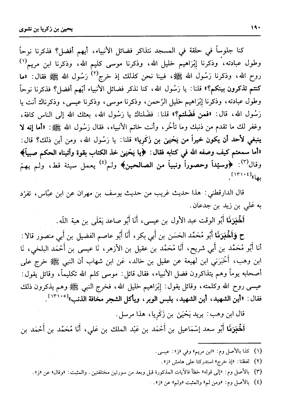 كنا جلوسا في حلقة في يالمسجد نتذاكر فضائل الأنبياء أيهم أفضل فذكرنا نوحا وطول عبادته وذكرنا إبراهيم خليل الله وذكرنا موسى كليم الله وذكرنا ابن مريم (1) روح الله وذكرنا رسول الله (صلى الله عليه وسلم) فبينا نحن كذلك إذ خرج (2) رسول الله (صلى الله عليه وسلم) فقال ما كنتم تذكرون بينكم قلنا يا رسول الله كنا نذكر فضائل الأنبياء أيهم أفضل فذكرنا نوحا وطول عبادته وذكرنا إبراهيم خليل الرحمن وذكرنا موسى وذكرنا عيسى وذكرناك أنت يا رسول الله قال فمن فضلتم قلنا فضلناك يا رسول الله بعثك الله إلى الناس كافة وغفر لك ما تقدم من ذنبك وما تأخر وأنت خاتم الأنبياء فقال رسول الله (صلى الله عليه وسلم) أما إنه لا ينبغي لأحد أن يكون خيرا من يحيى بن زكريا قلنا يا رسول الله ومنأين ذلك قال أما سمعتم كيف وصفه الله في كتابه فقال " يا يحيى خذ الكتاب بقوة وآتيناه الحكم صبيا " وقال (3) " وسيدا وحصورا ونبيا من الصالحين " ولم (4) يعمل سيئة قط ولم يهم بها