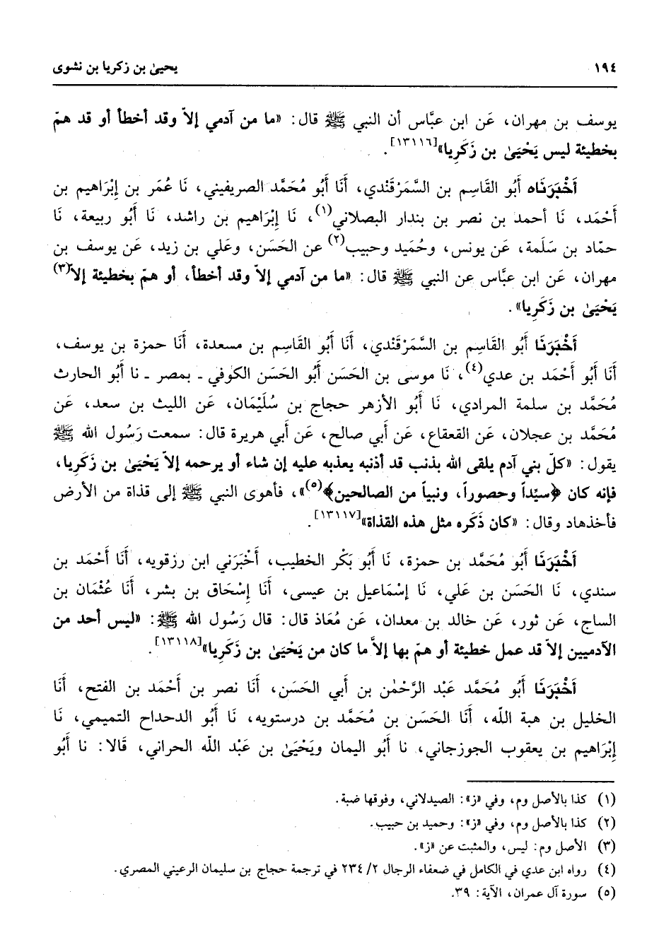 [13116] أخبرناه أبو القاسم بن السمرقندي أنا أبو محمد الصريفيني نا عمر بن إبراهيم بن أحمد نا أحمد بن نصر بن بندار البصلاني (1) نا إبراهيم بن راشد نا أبو ربيعة نا حماد بن سلمة عن يونس وحميد وحبيب (2) عن الحسن وعلي بن زيد عن يوسف بن مهران عن ابن عباس عن النبي (صلى الله عليه وسلم) قال ما من آدمي إلا وقد أخطأ أو هم بخطيئة إلا (3) يحيى بن زكريا أخبرنا أبو القاسم بن السمرقندي أنا أبو القاسم بن مسعدة أنا حمزة بن يوسف أنا أبو أحمد بن عدي (4) نا موسى بن الحسن أبو الحسن الكوفي بمصر نا أبوا لحارث محمد بن سلمة المرادي نا أبو الأزهر حجاج بن سليمان عن الليث بن سعد عن محمد بن عجلان عن القعقاع بن أبي صالح عن أبي هريرة قال سمعت رسول الله (صلى الله عليه وسلم) يقول كل بني آدم يلقى الله بذنب قد أذنبه يعذبه عليه إن شاء أو يرحمه إلا يحيى بن زكريا فإنه كان " سيدا وحصورا ونبيا من الصالحين " (5) فأهوى النبي (صلى الله عليه وسلم) إلى قذاة من الأرض فأخذهاد وقال كان ذكره مثل هذه القذاة