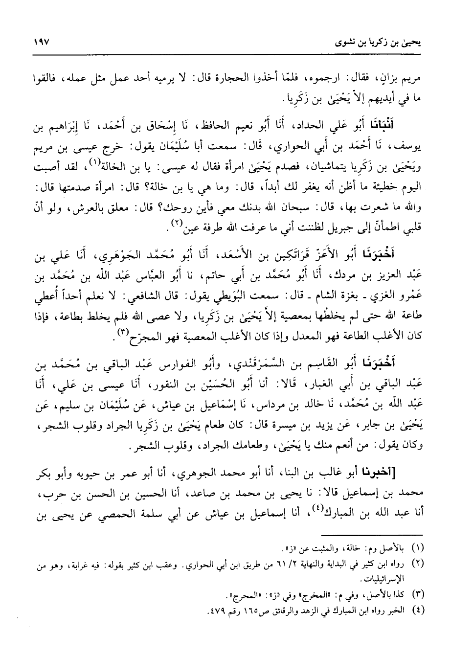 مريم بزان فقال ارجموه فلما أخذوا الحجارة قال لا يرميه أحد عمل مثل عمله فالقوا ما في أيديهم إلا يحيى بن زكريا أنبأنا أبو علي الحداد أنا أبو نعيم الحافظ نا إسحاق بن أحمد نا إبراهيم بن يوسف نا أحمد بن أبي الحواري قال سمعت أبا سليمان يقول خرج عيسى بن مريم ويحيى بن زكريا يتماشيان فصدم يحيى امرأة فقال له عيسى يا بن الخالة (1) لقد أصبت اليوم خطيئة ما أظن أنه يغفر لك أبدا قال وما هي يا بن خالة قال امرأة صدمتها قالو الله ما شعرت بها قال سبحان الله بدنك معي فأين روحك قال معلق بالعرش ولو أن قلبي اطمأن إلى جبريل لظننت أني ما عرفت الله طرفة عين (2) أخبرنا أبو الأعز قراتكين بن الأسعد أنا أبو محمد الجوهري أنا علي بن عبد العزيز بن مردك أنا أبو محمد بن أبي حاتم نا أبو العباس عبد الله بن محمد بن عمرو الغزي بغزة الشام قال سمعت البويطي يقول قال الشافعي لا نعلم أحدا أعطي طاعة الله حتى لم يخلطها بمعصية إلا يحيى بن زكريا ولا عصى الله فلم يخلط بطاعة فإذا كان الأغلب الطاعة فهو المعدل وإذا كان الأغلب المعصية فهو المجرح (3) أخبرنا أبو القاسم بن السمرقندي وأبو الفوارس عبد الباقي بن محمد بن عبد الباقي بن أبي الغبار قالا أنا أبو الحسين بن النقور أنا عيسى بن علي أنا عبد الله بن محمد نا خالد بن مرادس نا إسماعيل بن عياش عن سليمان بن سليم عن يحيى بن جابر عن يزيد بن ميسرة قال كان طعام يحيى بن زكريا الجراد وقلوب الشجر وكان يقول من أنعم منك يا يحيى وطعامك الجراد وقلوب الشجر أخبرنا أبو غالب بن البنا أنا أبو محمد الجوهري أنا أبو عمر بن حيوية وأبو بكر محمد بن إسماعيل قالا نا يحيى بن محمد بن صاعد أنا الحسين بن الحسن بن حرب أنا عبد الله بن المبارك (4) أنا إسماعيل بن عياش عن أبي سلمة الحمصي عن يحيى بن