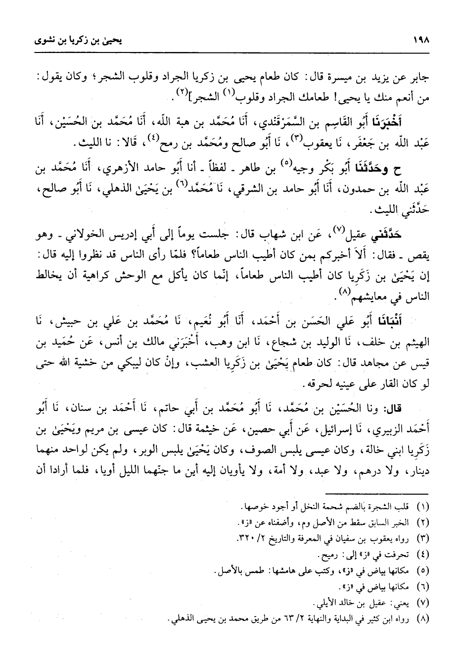 جابر عن يزيد بن ميسرة قال كان طعام يحيى بن زكريا الجراد وقلوب الشجر وكان يقول من أنعم منك يا يحيى طعامك الجراد وقلوب (1) الشجر (2) أخبرنا أبو القاسم بن السمر قندي أنا محمد بن هبة الله أنا محمد بن الحسين أنا عبد الله بن جعفر نا يعقوب (3) نا أبو صالح ومحمد بن رمح (4) قالا نا الليث ح وحدثنا أبو بكر وجيه (5) بن طاهر لفظا أنا أبو حامد الأزهري أنا محمد بن عبد الله بن حمدون أنا أبو حامد بن الشرقي نا محمد (6) بن يحيى الذهلي نا أبو صالح حدثني الليث حدثني عقيل (7) عن ابن شهاب قال جلست يوما إلى أبي إدريس الخولاني وهو يقص فقال ألا أخبركم بمن كان أطيب الناس طعاما فلما رأى الناس قد نظروا إليه قال إن يحيى بن زكريا كان أطيب الناس طعاما إنما كان يأكل مع الوحش كراهية أن يخالط الناس في معايشهم (8) أنبأنا أبو علي الحسن بن أحمد أنا أبو نعيم نا محمد بن علي بن حبيش نا الهيثم بن خلف نا الوليد بن شجاع نا ابن وهب أخبرني مالك بن أنس عن حميد بن قيس عن مجاهد قال كان طعام يحيى بن زكريا العشب وإن كان ليبكي من خشية الله حتى لو كان القار على عينية لحرقه قال ونا الحسين بن محمد نا أبو محمد بن أبي حاتم نا أحمد بن سنان نا أبو أحمد الزبيري نا إسرائيل عن أبي حصين عن خيثمة قال كان عيسى بن مريم ويحيى بن زكريا ابني خالة وكان عيسى يلبس الصوف وكان يحيى يلبس الوبر ولم يكن لواحد منهما دينار ولا درهم ولا عبد ولا أمة ولا يأويان إليه أين ما جنهما الليل أويا فلما أرادا أن