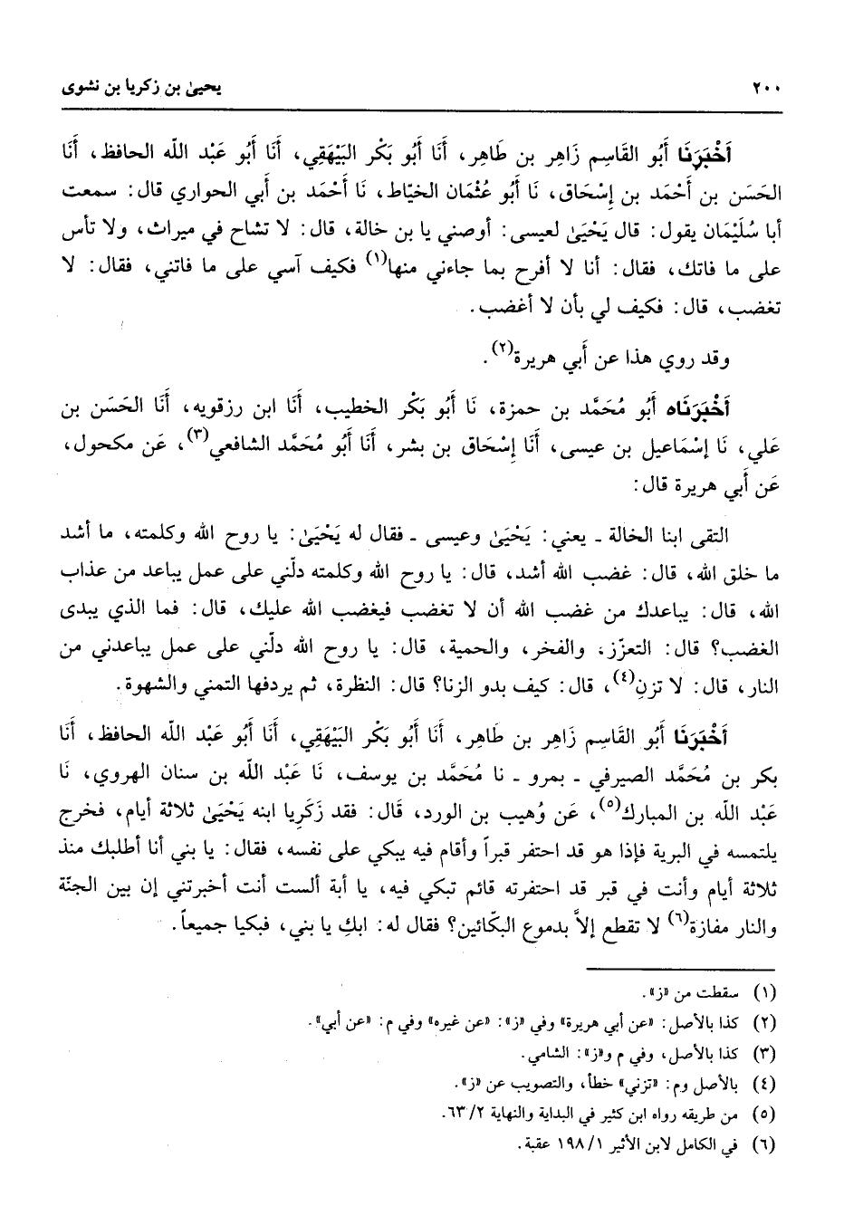 أخبرنا أبو القاسم زاهر بن طاهر أنا أبو بكر البيهقي أنا أبو عبد الله الحافظ أنا الحسن بن أحمد بن إسحاق نا أبو عثمان الخياط نا أحمد بن أبي الحواري قال سمعت أبا سليمان يقول قال يحيى لعيسى أوصني يا بن خالة قال لا تشاح في ميراث ولا تأس على ما فاتك فقال أنا لا أفرح بما جاءني منها (1) فكيف آسي على ما فاتني فقال لا تغضب قال فكيف لي بأن لا أغضب وقد روي هذا عن أبي هريرة (2) أخبرناه أبو محمد بن حمزة نا أبو بكر الخطيب أنا ابن رزقوية أنا الحسن بن علي نا إسماعيل بن عيسى أنا إسحاق بن بشر أنا أبو محمد الشافعي (3) عن مكحول عن أبي هريرة قال التقى ابنا الخالة يعني يعني وعيسى فقال له يحيى يا روح الله وكلمته ما أشد ما خلق الله قال غضب الله أشد قال يا روح الله وكلمته دلني على عمل يباعد من عذاب الله قال يباعدك من غضب الله أن لا تغضب فيغضب الله عليك قال فما الذي يبدي الغضب قال التعزز والفخر والحمية قال يا روح الله دلني على عمل يباعدني من النار قال لا تزن (4) قال كيف بدو الزنا قال النظرة ثم يردفها التمني والشهوة أخبرنا أبو القاسم زاهر بن طاهر أنا أبو بكر البيهقي أنا أبو عبد الله الحافظ أنا بكر بن محمد الصيرفي بمرو نا محمد بن يوسف نا عبد الله بن سنان الهروي نا عبد الله بن المبارك (5) عن وهيب بن الورد قال فقد زكريا ابنه يحيى ثلاثة أيام فخرج يلتمسه في البرية فإذا هو قد احتفر قبرا وأقام فيه يبكي على نفسه فقال يا بني أنا أطلبك منذ ثلاثة أيام وأنت في قبر قد احتفرته قائم تبكي فيه يا أبة ألست أنت أخبرتني إن بين الجنة والنار مفازة (6) لا تقطع إلا بدموع البكائين فقال له ابك يا بني فبكيا جميعا