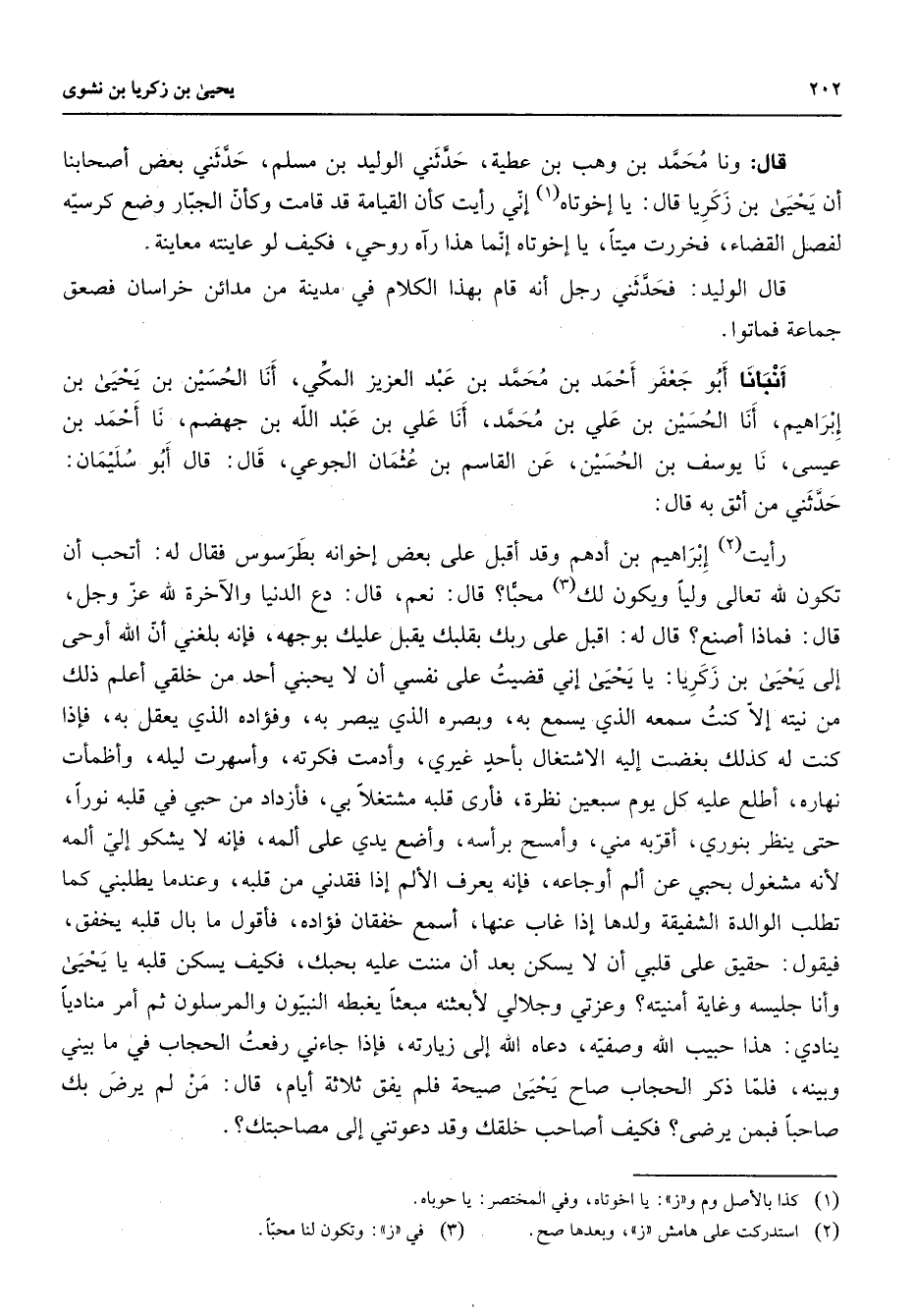قال ونا محمد بن وهب بن عطية حدثني الوليد بن مسلم حدثني بعض أصحابنا أن يحيى بن زكريا قال يا إخوتاه (1) إني رأيت كأن القيامة قد قامت وكأن الجبار وضع كرسيه لفصل القضاء فخررت ميتا يا إخوتاه إنما هذا رآه روحي فكيف لو عاينته معاينة قال الوليد فحدثني رجل أنه قام بهذا الكلام في مدينة من مدائن خراسان فصعق جماعة فماتوا أنبأنا أبو جعفر أحمد بن محمد بن عبد العزيز المكي أنا الحسين بن يحيى بن إبراهيم أنا الحسين بن علي بن محمد أنا على بن عبد الله بن جهضم نا أحمد بن عيسى نا يوسف بن الحسين عن القاسم بن عثمان الجوعي قال قال أبو سليمان حدثني من أثق به قال رأيت (2) ابراهيم بن أدهم وقد أقبل على بعض إخوانه بطرسوس فقال له أتحب أن تكون لله تعالى وليا ويكون لك (3) محبا قال نعم قال دع الدنيا والآخرة لله عز وجل قال فماذا أصنع قال له اقبل على ربك بقلبك يقبل عليك بوجهه فإنه بلغني أن الله أوحى إلى يحيى بن زكريا يا يحيى إني قضيت على نفسي أن لا يحبني أحد من خلقي أعلم ذلك من نيته إلا كنت سمعه الذي يسمع به وبصره الذي يبصر به وفؤاده الذي يعقل به فإذا كنت له كذلك بغضت إليه الاشتغال بأحد غيري وأدمت فكرته وأسهرت ليله وأظمأت نهاره أطلع عليه كل يوم سبعين نظرة فأرى قلبه مشتغلا بي فأزداد من حبي في قلبه نورا حتى ينظر بنوري أقربه مني وأمسح برأسه وأضع يدي على ألمه فإنه لا يشكو إلي ألمه لأنه مشغول بحبي عن ألم أوجاعه فإنه يعرف الألم إذا فقدني من قلبه وعندما يطلبني كما تطلب الوالدة الشفيقة ولدها إذا غاب عنها أسمع خفقان فؤاده فأقول ما بال قلبه يخفق فيقول حقيق على قلبي أن لا يسكن بعد أن مننت عليه بحبك فكيف يسكن قلبه يا يحيى وأنا جليسه وغاية أمنيته وعزتي وجلالي لأبعثنه مبعثا يغبطه النبيون والمرسلون ثم أمر مناديا ينادي هذا حبيب الله وصفيه دعاه الله إلى زيارته فإذا جاءني رفعت الحجاب فيما بيني وبينه فلما ذكر الحجاب صاح يحيى صيحة فلم يفق ثلاثة أيام قال من لم يرض بك صاحبا فبمن يرضى فكيف أصاحب خلقك وقد دعوتني إلى مصاحبتك