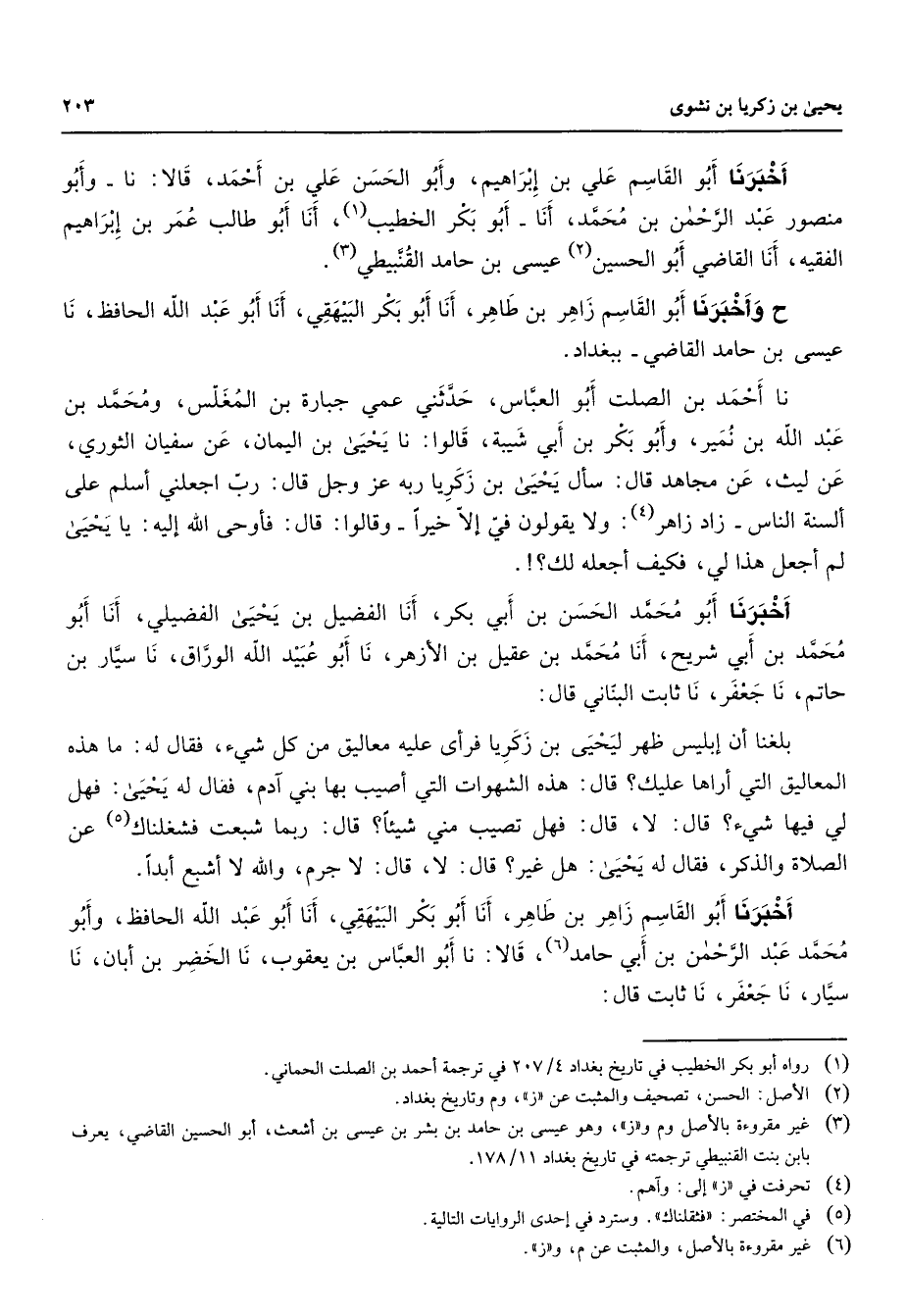 أخبرنا أبو القاسم علي بن إبراهيم وأبو الحسن علي بن أحمد قالا نا وأبو منصور عبد الرحمن بن محمد أنا أبو بكر الخطيب (1) أنا أبو طالب عمر بن إبراهيم الفقيه أنا القاضي أبو الحسين (2) عيسى بن حامد القنبيطي (3) ح وأخبرنا أبو القاسم زاهر بن طاهر أنا أبو بكر البيهقي أنا أبو عبد الله الحافظ نا عيسى بن حامد القاضي ببغداد نا أحمد بن الصلت أبو العباس حدثني عمي جبارة بن المغلس ومحمد بن عبد الله بن نمير وأبو بكر بن أبي شيبة قالوا نا يحيى بن اليمان عن سفيان الثوري عن ليث عن مجاهد قال سأل يحيى بن زكريا ربه عز وجل قال رب اجعلني أسلم على ألسنة الناس زاد زاهر (4) ولا يقولون في إلا خيرا وقالوا قال فأوحى الله إليه يا يحيى لم اجعل هذا لي فكيف اجعله لك اخبرنا أبو محمد الحسن بن ابي بكر أنا الفضيل بن يحيى الفضيلي انا أبو محمد بن ابي شريح انا محمد بن عقيل بن الازهر نا أبو عبيد الله الوراق نا سيار بن حاتم نا جعفر نا ثابت البناني قال بلغنا أن إبليس ظهر ليحيى بن زكريا فرأى عليه معاليق من كل شئ فقال له ما هذه المعاليق التى أراها عليك قال هذه الشهوات التي أصيب بها بني آدم فقال له يحيى فهل لي فيها شئ قال لا قال فهل تصيب مني شيئا قال ربما شبعت فشغلناك (5) عن الصلاة والذكر فقال له يحيى هل غير قال لا قال لا جرم والله لا أشبع أبدا أخبرنا أبو القاسم زاهر بن طاهر أنا أبو بكر البيهقي أنا أبو عبد الله الحافظ وأبو محمد عبد الرحمن بن أبي حامد (6) قالا نا أبو العباس بن يعقوب نا الخضر بن أبان نا سيار نا جعفر نا ثابت قال