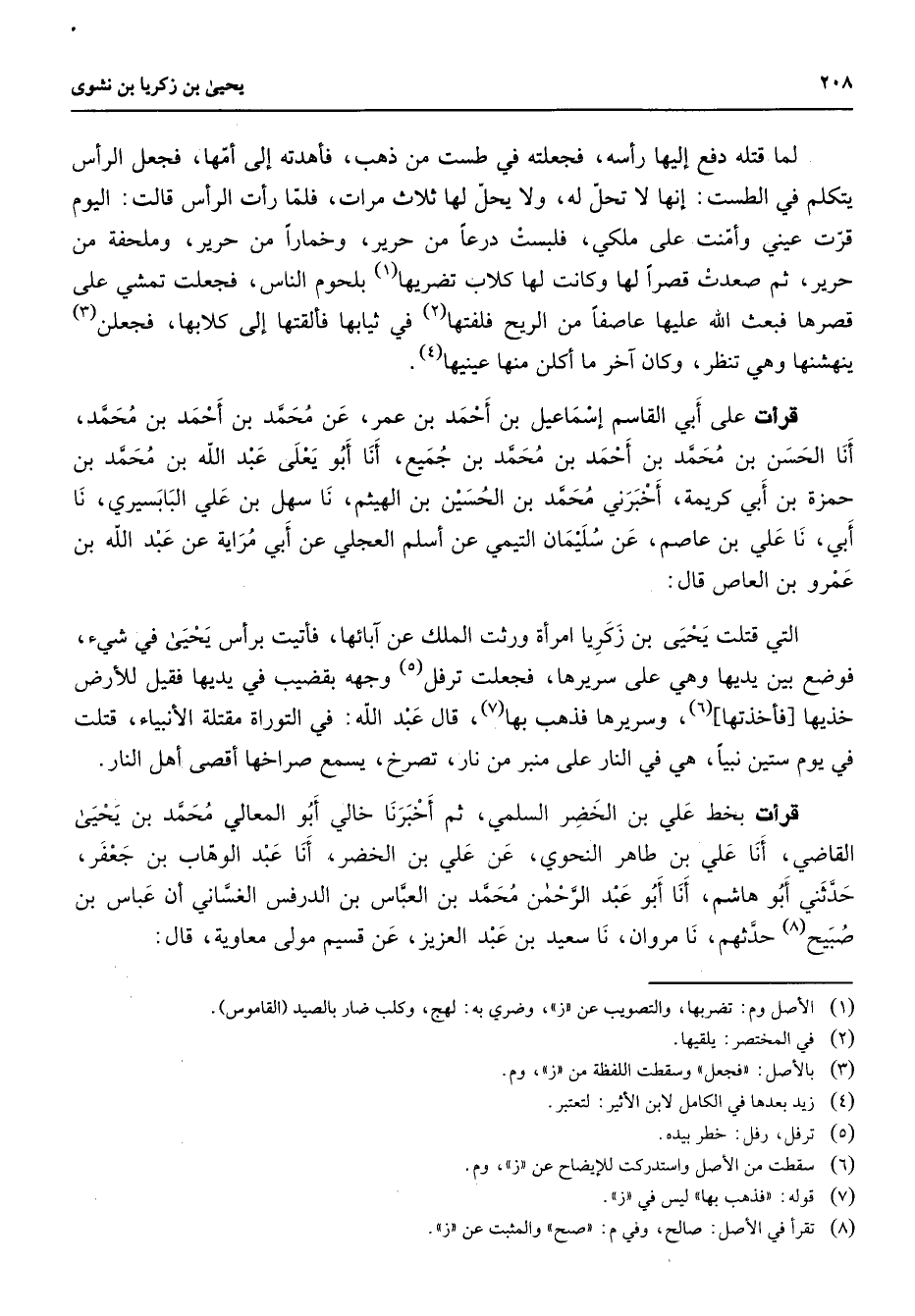 لما قتله دفع إليها رأسه فجعلته في طست من ذهب فأهدته إلى أمها فجعل الرأس يتكلم في الطست إنها لا تحل له ولا يحل لها ثلاث مرات فلما رأت الرأس قالت اليوم قرة عيني وأمنت على ملكي فلبست درعا من حرير وخمارا من حرير وملحفة من حرير ثم صعدت قصرا لها وكانت لها كلاب تضربها (1) بلحوم الناس فجعلت تمشي على قصرها فبعث الله عليها عاصفا من الريح فلفتها (2) في ثيابها فألقتها إلى كلابها فجعلن (3) ينهشنها وهي تنظر وكان آخر ما أكلن منها عينيها (4) قرأت على أبي القاسم إسماعيل بن أحمد بن عمر عن محمد بن () أحمد بن محمد أنا الحسن بن محمد بن أحمد بن محمد بن جميع أنا أبو يعلى عبد الله بن محمد بن حمزة بن أبي كريمة أخبرني محمد بن الحسين بن الهيثم نا سهل بن علي البابسيري نا أبي نا علي بن عاصم عن سليمان التيمي عن أسلم العجلي عن أبي مراية عن عبد الله بن عمرو بن العاص قال التى قتلت يحيى بن زكريا امرأة ورثت الملك عن آبائها فأتيت برأس يحيى في شئ فوضع بين يديها وهي على سريرها فجعلت ترفل (5) وجهه بقضيب في يديها فقيل للأرض خذيها فأخذتها (6) وسريرها فذهب بها (7) قال عبد الله في التوراة مقتلة الأنبياء قتلت في يوم ستين نبيا هي في النار على منبر من نار تصرخ يسمع صراخها أقصى أهل النار قرأت بخط علي بن الخضر السلمي ثم أخبرنا خالي أبو المعالي محمد بن يحيى القاضي أنا علي بن طاهر النحوي عن علي بن الخضر أنا عبد الوهاب بن جعفر حدثني أبو هاشم أنا أبو عبد الرحمن محمد بن العباس بن الدرفس الغساني أن عباس بن صبيح (8) حدثهم نا مروان نا سعيد بن عبد العزيز عن قسيم مولى معاوية قال