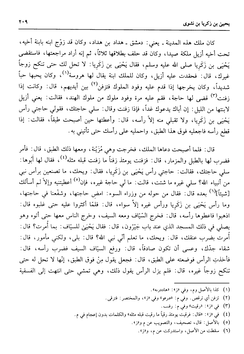 كان ملك هذه المدينة يعني دمشق هداد بن هداد وكان قد زوج ابنه بابنة أخيه تحت أخيه أزيل ملكه صيدا وكان قد حلف بطلاقها ثلاثا ثم إنه أراد مراجعتها فاستقضى يحيى فقال يحيى بن زكريا بن زكريا لا تحل لك حتى تنكح زوجا غيرك قال فحقدت عليه أزيل وكان للملك ابنة يقال لها هروسة (1) وكان يحبها حبا شديدا وكان يخرجها إذا قدم عليه وفود الملوك فتزفن (2) بين أيديهم قال وكانت إذا زفنت (3) قضى لها حاجة فقم عليه مرة وفود ملوك من ملوك الهند فقالت يعني أزيل لابنتها من الليل إن أباك يدعوك غدا فإذا زفنت وقال سلي حاجتك فقولي حاجتي رأس يحيى بن زكريا ولا تقبلي منه إلا رأسه قال وأعطتها حين أصبحت طبقا فقالت إذا قطع رأسه فاجعليه فوق هذا الطبق واحمليه على رأسك حتى تأتيني به قال فلما أصبحت دعاها الملك فخرجت وهي مزينة ومعها ذلك الطبق قال فأمر فضرب لها بالطبل والمزمار قال فزفنت يومئذ زفنا ما زفنت قبله مثله (4) فقال لها أبوها سلي حاجتك فقالت حاجتي رأس يحيى بن زكريا فقال ويحك ما تصنعين برأس نبي من أنبياء الله سلي غيره ما شئت قالت ما لي حاجة غيره فإن (5) أعطيتنيه وإلا لم أسالك شيئا (6) بعده قال فقال من حوله من وزراء السوء امض حاجتها وشفعنا في حاجتها رأس يحيى بن زكريا وما رأس غيره إلا سواء قال فلما أكثروا عليه حتى غلبوه قال اذهبوا فأعطوها رأسه قال فخرج السياف ومعه السيف وخرج الناس معها حتى اتوه وهو يصلي في ذلك المسجد الذي عند باب جيرون قال فقال يحيى للسياف بما أمرت قال أمرت بضرب عنقك قال ويحك ما تعلم أني نبي الله قال بلى ولكني مأمور قال شقاء جدك وعسى أن تكون صادقا قال ورفع السياف السيف فضرب رأسه قال فأخذت الرأس فوضعته على الطبق قال فجعل يقول من فوق الطبق إنها لا تحل له حتى تنكح زوجا غيره قال فلم يزل الرأس يقول ذلك وهي تمشي حتى انتهت إلى الفسقية