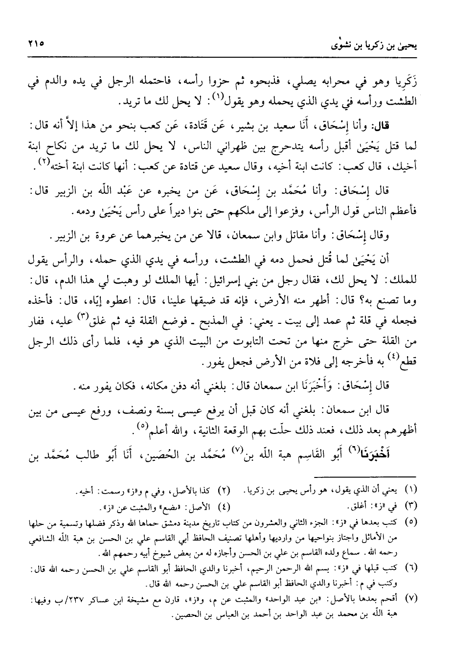 زكريا وهو في محرابه يصلي فذبحوه ثم حزوا رأسه فاحتمله الرجل في يده والدم في الطشت ورأسه في يدي الذي يحمله وهو يقول (1) لا يحل لك ما تريد قال وأنا إسحاق أنا سعيد بن بشير عن قتادة عن كعب بنحو من هذا إلا أنه قال لما قتل يحيى أقبل رأسه يتدحرج بين ظهراني الناس لا يحل لك ما تريد من نكاح ابنة أخيك قال كعب كانت ابنة أخيه وقال سعيد عن قتادة عن كعب أنها كانت ابنة أخته (2) قال إسحاق وأنا محمد بن إسحاق عن من يخبره عن عبد الله بن الزبير قال فأعظم الناس قول الرأس وفزعوا إلى ملكهم حتى بنوا ديرا على رأس يحيى ودمه وقال إسحاق وأنا مقاتل وابن سمعان قالا عن من يخبرهما عن عروة بن الزبير أن يحيى لما قتل فحمل دمه في الطشت ورأسه في يدي الذي حمله والرأس يقول للملك لا يحل لك فقال رجل من بني إسرائيل أيها الملك لو وهبت لي هذا الدم قال وما تصنع به قال أطهر منه الأرض فإنه قد ضيقها علينا قال اعطوه إياه قال فأخذه فجعله في قلة ثم عمد إلى بيت يعني في المذبح فوضع القلة فيه ثم غلق (3) عليه ففار من القلة حتى خرج منها من تحت التابوت من البيت الذي هو فيه فلما رأى ذلك الرجل قطع (4) به فأخرجه إلى فلاة من الأرض فجعل يفور قال إسحاق وأخبرنا ابن سمعان قال بلغني أنه دفن مكانه فكان يفور منه قال ابن سمعان بلغني أنه كان قبل أن يرف عيسى بسنة ونصف ورفع عيسى من بين أظهرهم بعد ذلك فعند ذلك حلت بهم الوقعة الثانية والله أعلم (5) أخبرنا (6) أبو القاسم هبة الله بن (7) محمد بن الحصين أنا أبو طالب محمد بن