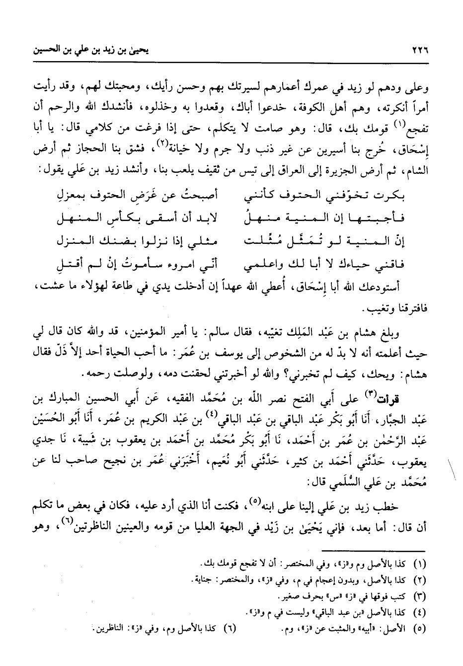 وعلى ودهم لو زيد في عمرك أعمارهم لسيرتك بهم وحسن رأيك ومحبتك لهم وقد رأيت أمرا أنكرته وهو أهل الكوفة خدعوا أباك وقعدوا به وخذلوه فأنشدك الله والرحم أن تفجع (1) قومك بك قال وهو صامت لا يتكلم حتى إذا فرغت من كلامي قال يا أبا إسحاق خرج بنا أسيرين عن غير ذنب ولا جرم ولا خيانة (2) فشق بنا الحجاز ثم أرض الشام ثم أرض الجزيرة إلى العراق إلى تيس من ثقيف يلعب بنا أنشد زيد بن علي يقول * بكرت تخوفني الحتوف كأنني * أصبحت عن غرض الحتوف بمعزل فأحببتها إن المنية منهل * لا بد أن أسقى بكأس المنهل إن المنية لو تمثل مثلت * مثلي إذا نزلوا بضنك المنزل فاقني حياءك لا أبا لك واعلمي * أبي امروء سأموت إن لم أقتل * أستودعك الله أبا إسحاق أعطي الله عهددا إن أدخلت يدي في طاعة لهؤلاء ما عشت فافترقنا وتغيب وبلغ هشام بن عبد الملك تغيبه فقال سالم يا أمير المؤمنين قد والله كان قال لي حيث أعلمته أنه لا بد له من الشخوص إلى يوسف بن عمر ما أحب الحياة احد إلا ذل فقال هشام ويحك كيف لم تخبرني والله لو أخبرتني لحقنت دمه ولوصلت رحمه قرأت (3) على أبي الفتح نصر الله بن محمد الفقيه عن أبي الحسين المبارك بن عبد الجبار أنا أبو بكر عبد الباقر الباقي بن عبد الباقي (4) بن عبد الكريم بن عمر أنا أبو الحسين عبد الرحمن بن عمر بن أحمد نا أبو بكر محمد بن أحمد بن يعقوب بن شيبة نا جدي يعقوب حدثني أحمد بن كثير حدثني أبو نعيم أخبرني عمر بن نجيح صاحب لنا عن محمد بن علي السلمي قال خطب زيد بن علي الينا على ابنه (5) فكنت أنا الذي أرد عليه فكان في بعض ما تكلم أن قال أما بعد فإني يحيى بن زيد في الجهة العليا من قومه والعينين الناظرتين (6) وهو
