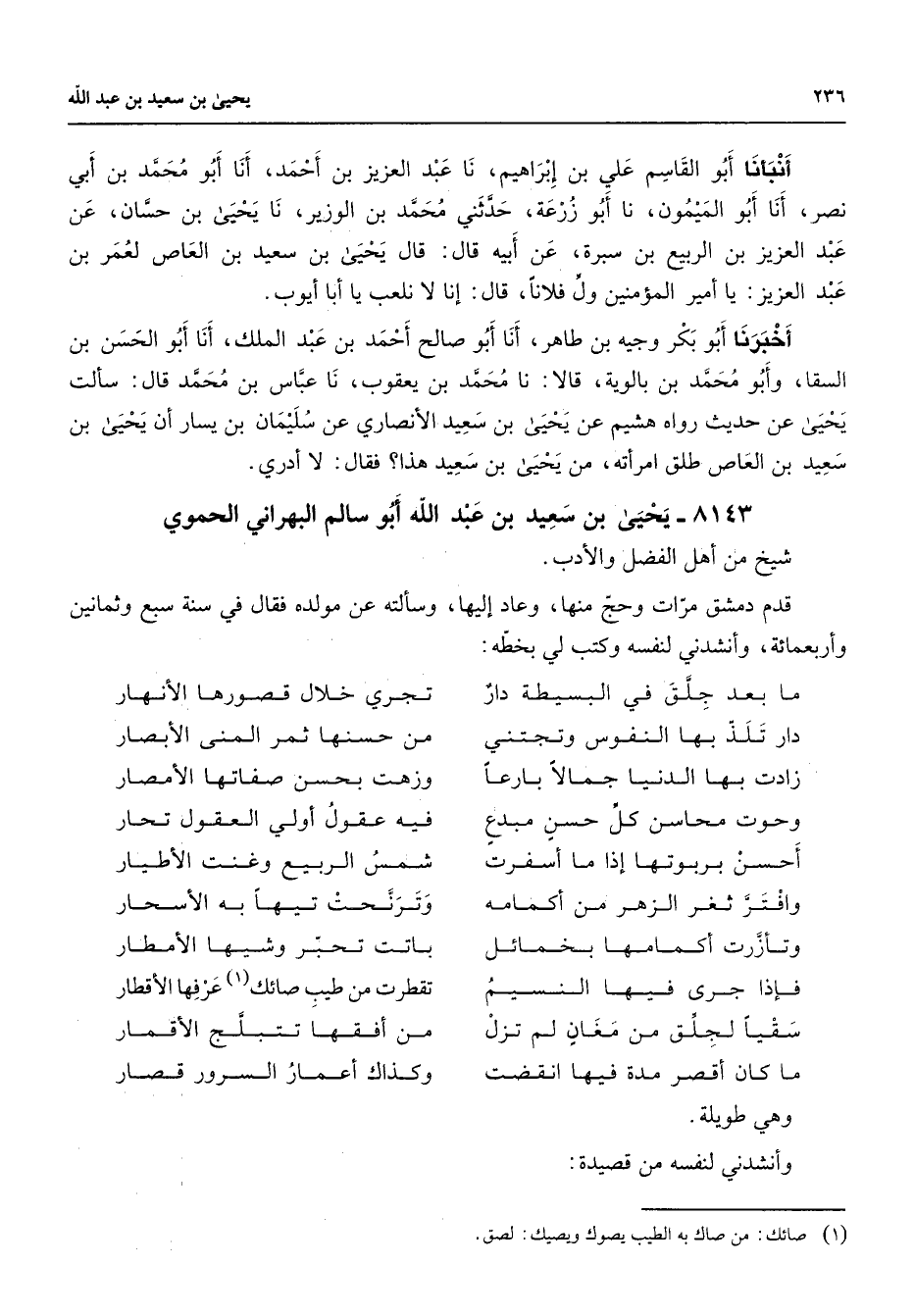 8143 - يحيى بن سعيد بن عبد الله أبو سالم البهراني الحموي شيخ من أهل الفضل والأدب قدم دمشق مرات وحج منها وعاد إليها وسألته عن مولده فقال في سنة سبع وثمانين وأربعمائة وأنشدني لنفسه وكتب لي بخطه * ما بعد جلق في البسيطة دار * تجري خلال قصورها الأنهار دار تلذ بها النفوس وتجتني * من حسنها ثمر المنى الأبصار زادت بها الدنيا جمالا بارعا * وزهت بحسن صفاتها الأمصار وحوت محاسن كل حسن مبدع * فيه عقول أولي العقول تحار أحسن بربوتها إذا ما أسفرت * شمس الربيع وغنت الأطيار وافتر ثغر الزهر من أكمامه * وترنحت تيها به الأسحار وتأزرت أكمامها بخمائل * باتت تحبر وشيها الأمطار فإذا جرى فيها النسيم * تقطرت من طيب صائك (1) عرفها الأقطار سقيا لجلق من مغان لم تزل * من أفقها تتبلج الأقمار ما كان أقصر مدة فيها انقضت * وكذاك أعمار السرور قصار * وهي طويلة وأنشدني لنفسه من قصيدة