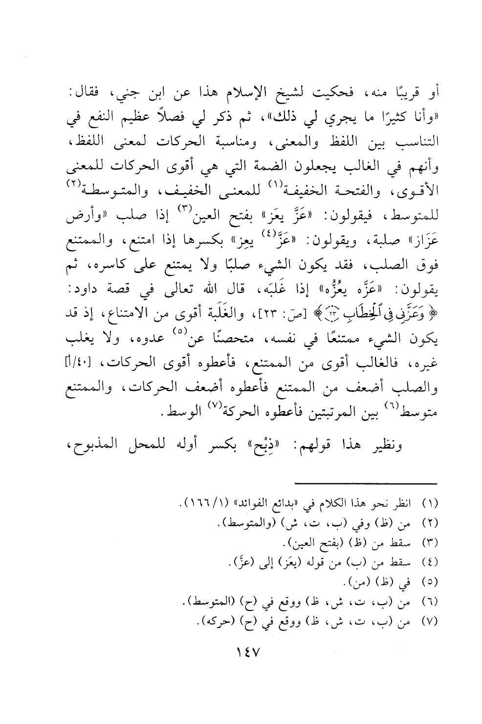 آو قريبا منه، فحكيت لشيخ الاسلام هذا عن ابن جني، فقال: