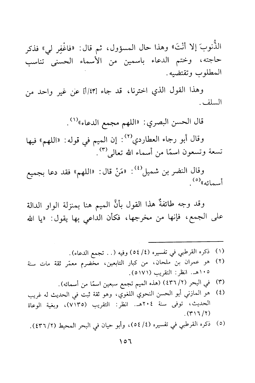 وقال النضر بن شميل (4): "من قال: "اللهم" فقد دعا بجميع